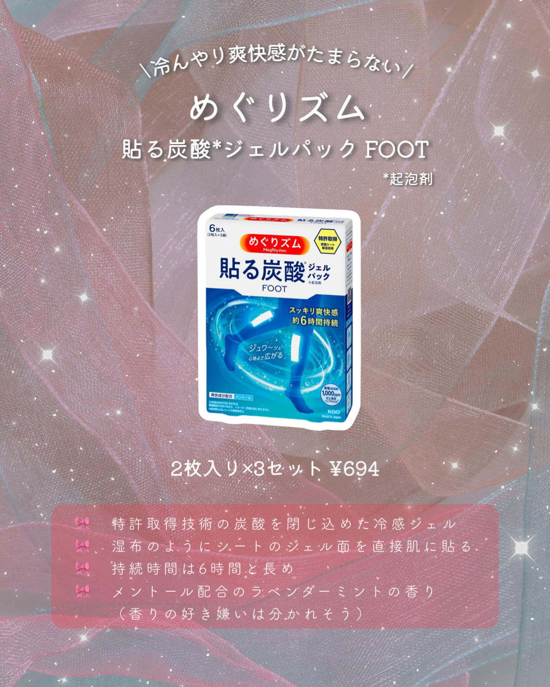 \ 9月のイベントもコレ貼ってこ👟 /☑︎めぐりズム貼る炭酸ジェルパックFOOT6枚入 694円今回ご紹介するアイテムは私が愛してやまないめぐりズムの貼る炭酸ジェルパックだよ🫧ふくらはぎに貼るだけで1日の疲れがスッとリラックスするようなひんや...