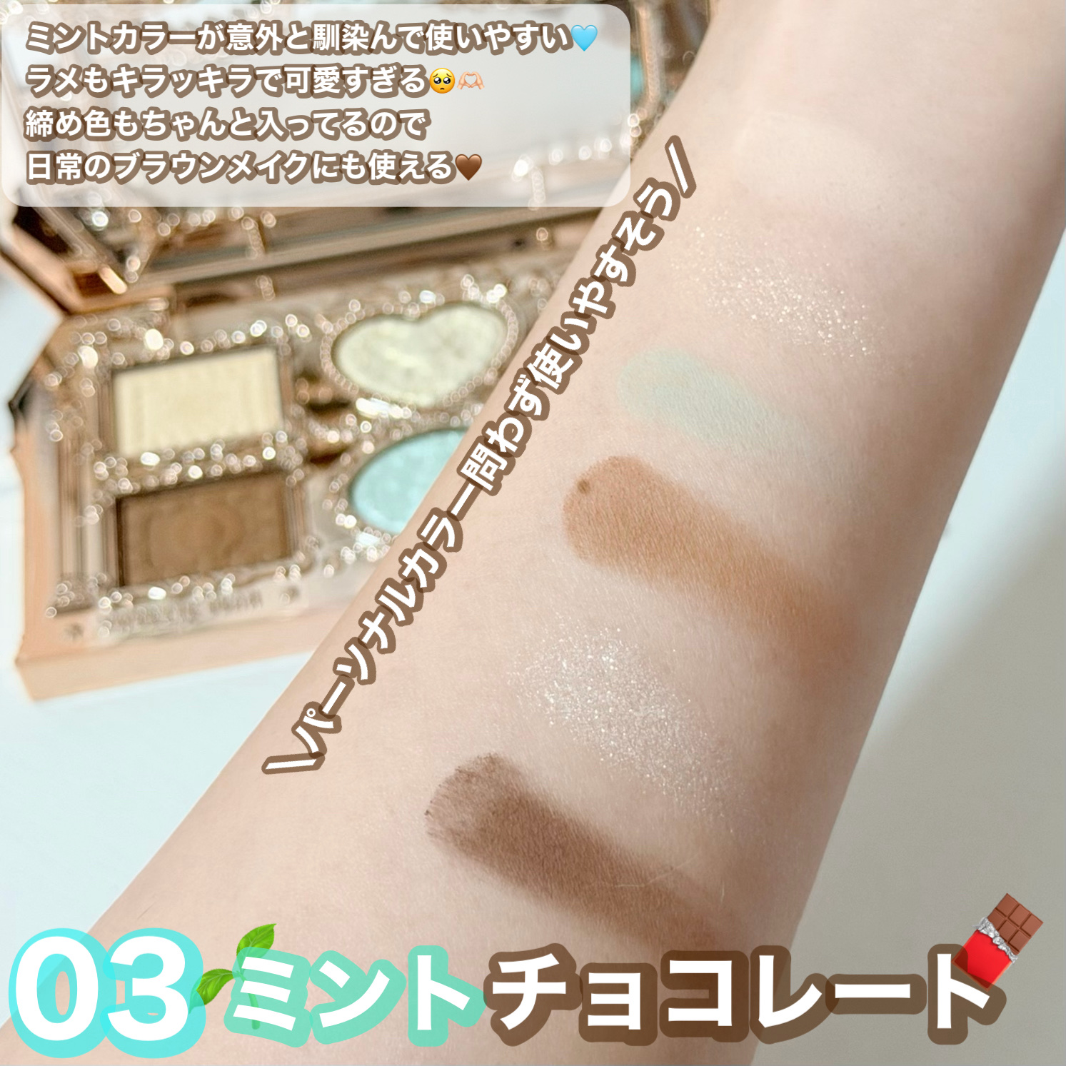 | アイシャドウパレットランキング第9位 | 光にあたるとキラッと輝くのにギラつき感はなくて、程よいツヤのようにも見える絶妙さがたまらない🥰 | 詳細を見る | |
