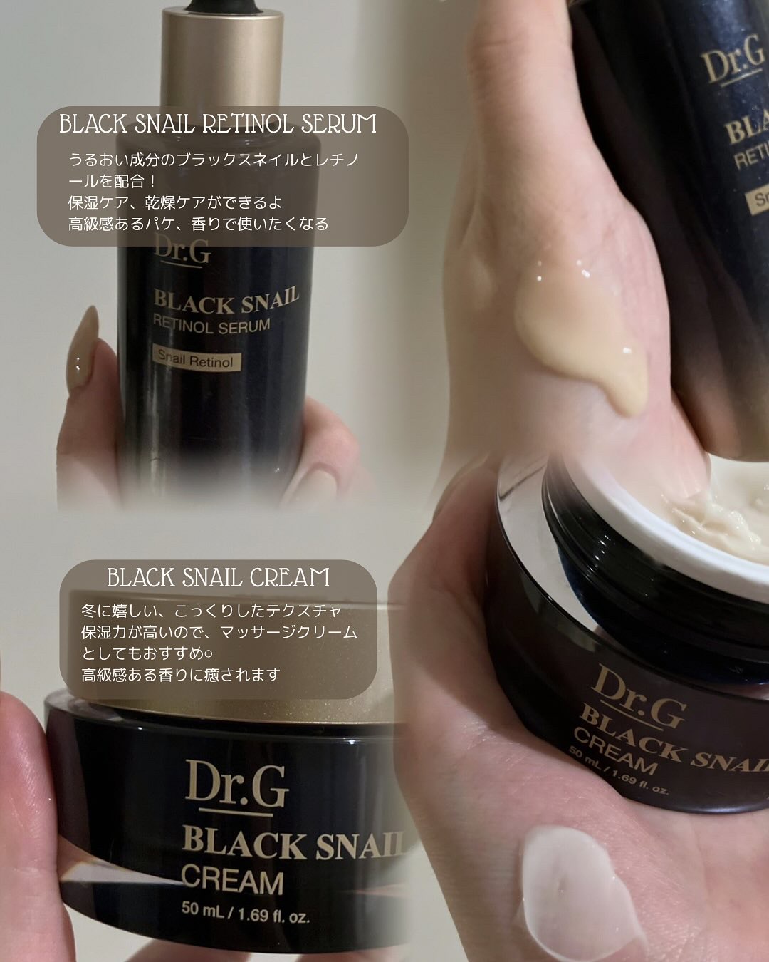 \乾燥で肌年齢を感じるあなたの味方🖤/ドクタージー:ブラックスネイルシリーズエイジングケア※ラインをご紹介!(※...年齢に応じたケアのこと)レチン(かたつむりのねばり)配合で乾燥やハリケアに🐌✨高級感あるパケ♬私はクリームが気に入ってしわが...