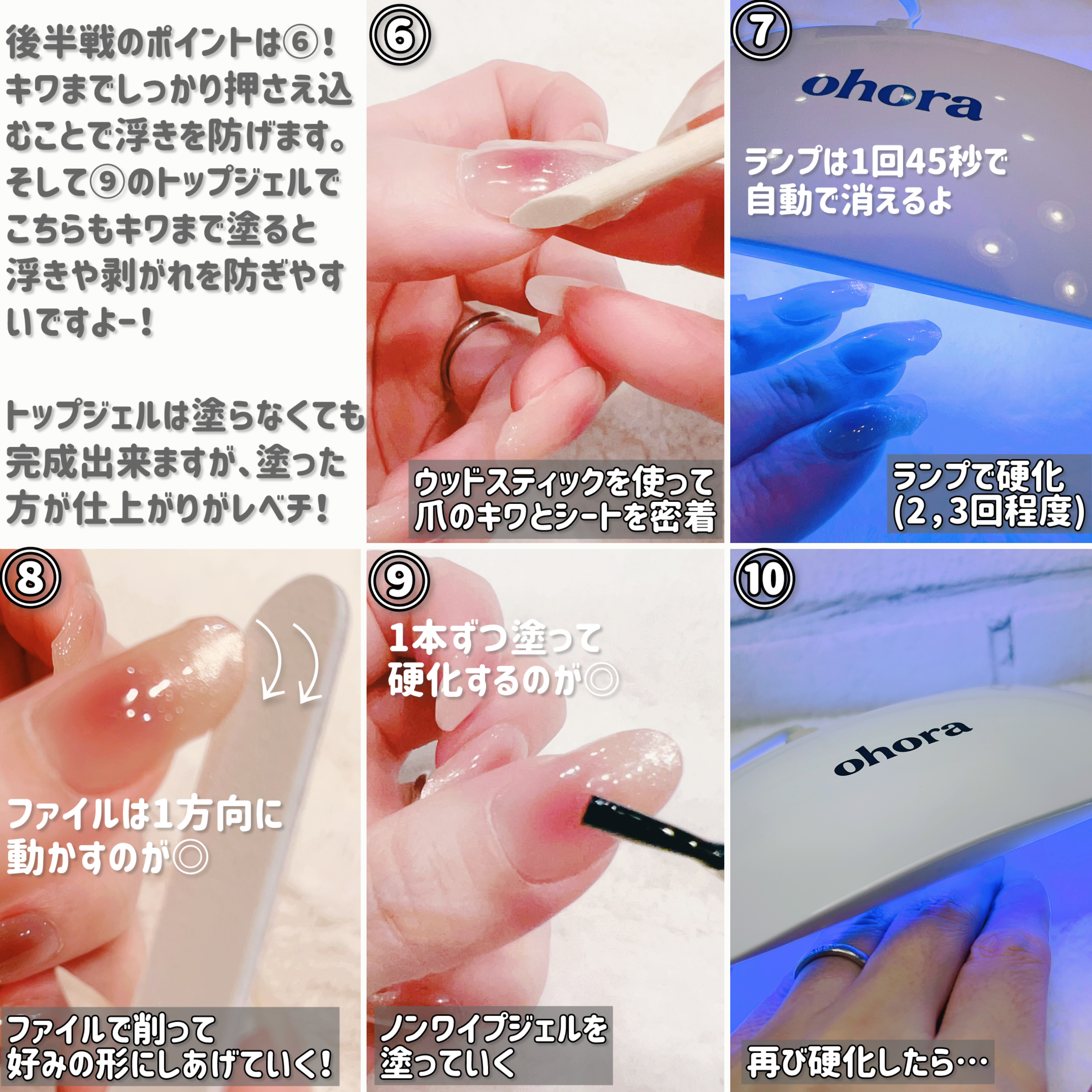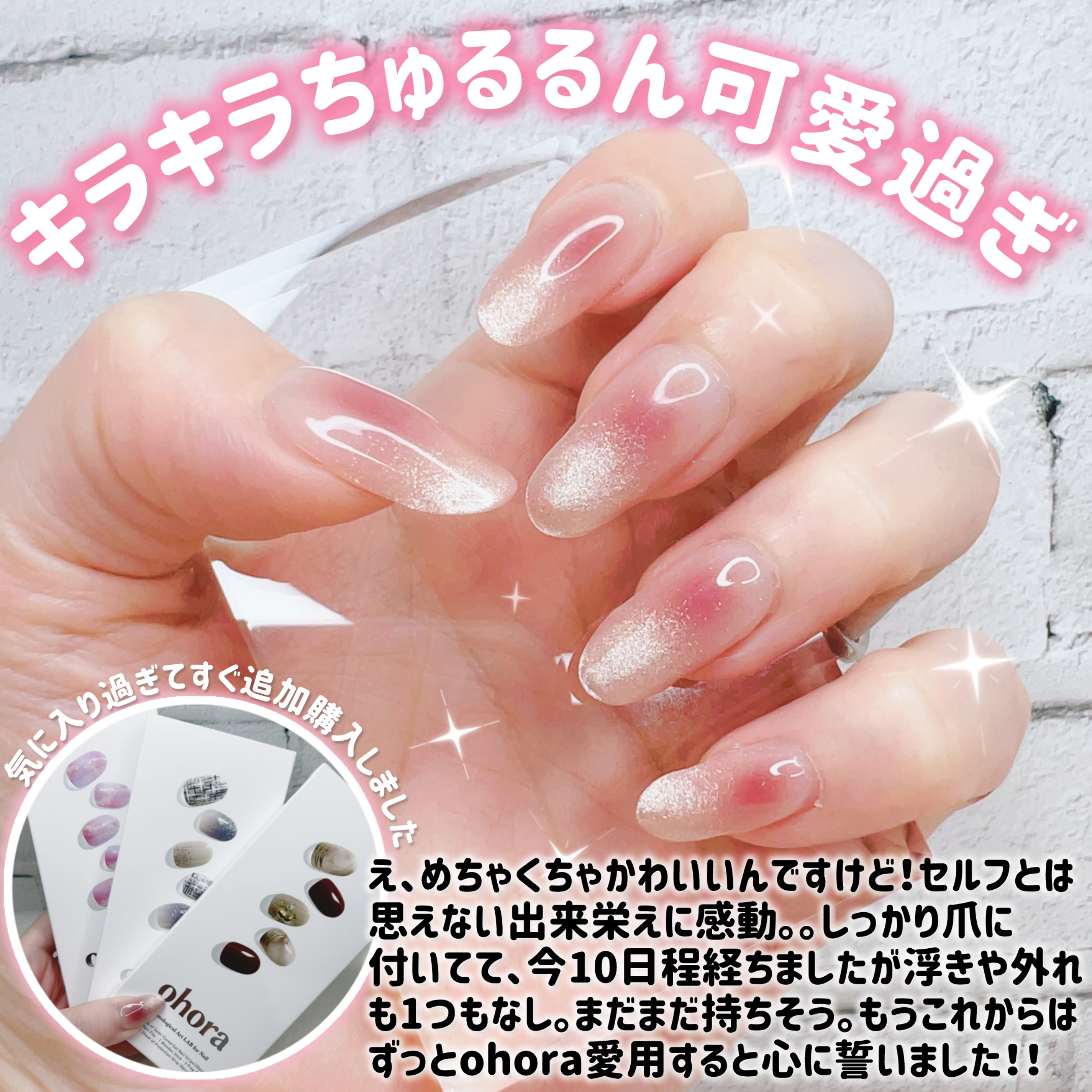 ohoraセミキュアジェル(シールタイプ)ネイルシールでよくおすすめされるのがohora♥️ネイルシール派の私はずっと気になっていました🌸ジェルを60%固めて作られているんだそう💎伸縮性のある柔らかい質感で、爪にピタッと密着してくれます🫶🏻剥...
