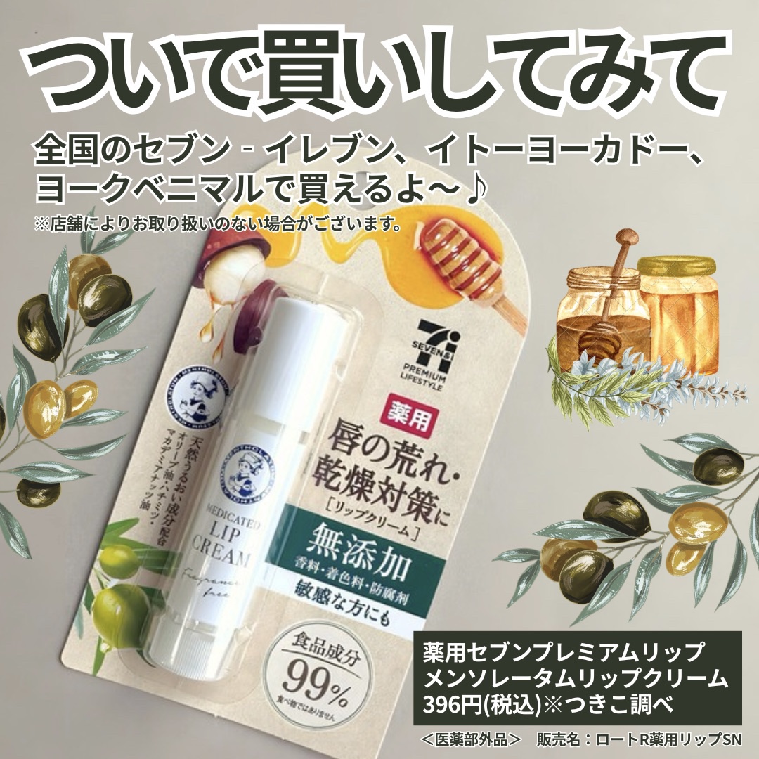 ロート製薬とセブン&アイが共同開発❣️ 低刺激の保湿リップがリニューアルして登場! 唇に使うものだからこそ食品成分99%*で作られていて無添加処方(無香料•無着色•防腐剤)になってるよ💗 オリーブ油•ハチミツ•マカデミアナッツ油の食品由来の天然うるおい成分配合✨ とろけるように馴染んで潤い感ある仕上がりに❣️