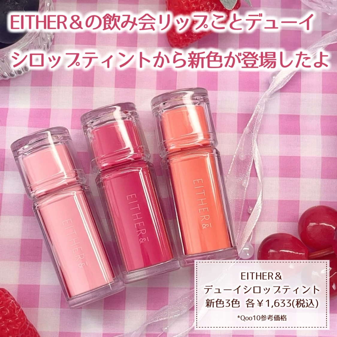 ❁❁❁☑️EITHER&┆DewySyrupTint▼07PINKHERTZ▼08CHERRYOLOGY▼09VITALISM❁❁❁SNSで話題のEITHER&のデューイシロップティントに新色が登場します🌟果汁シロップのようなちゅるんとした光...