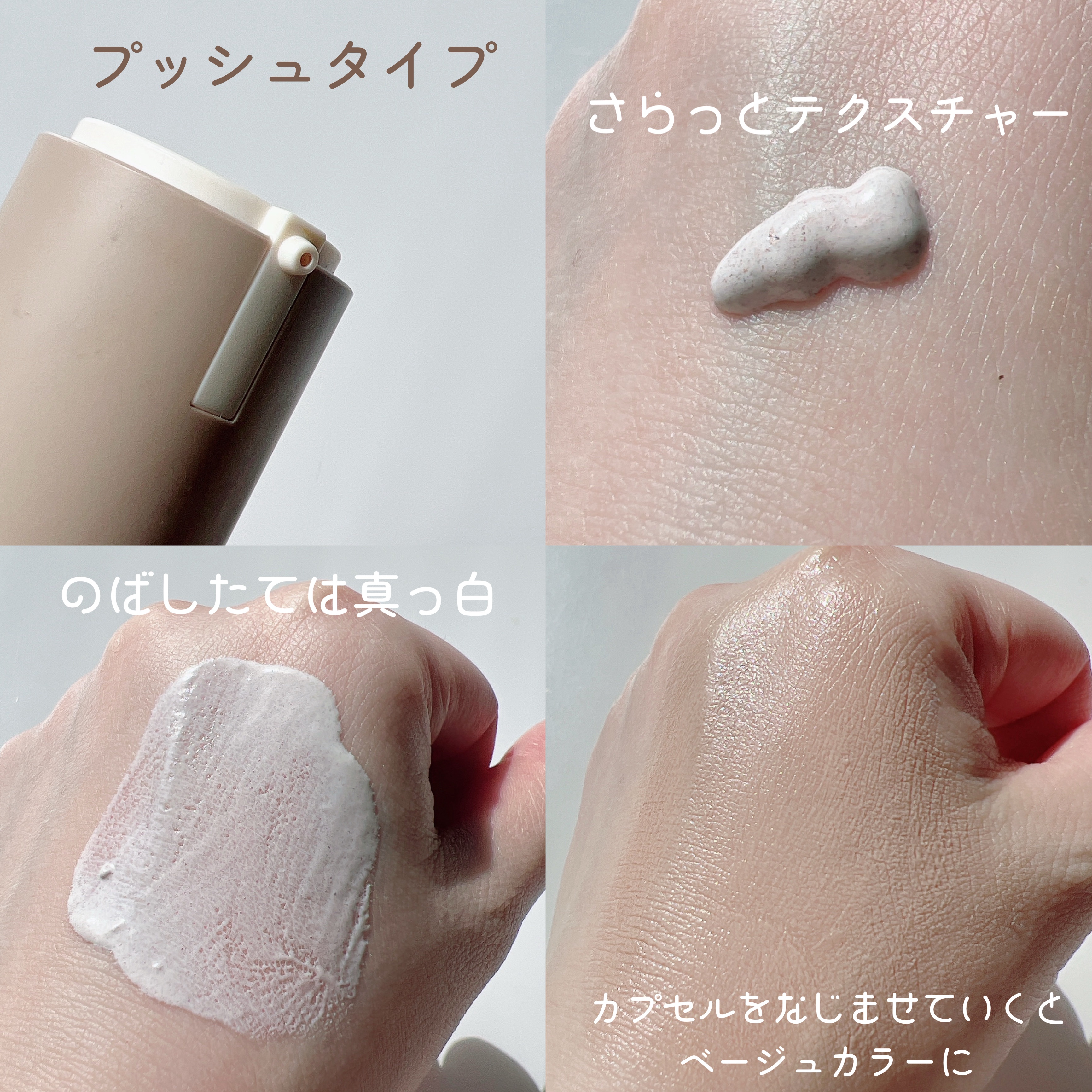 - ファンデーション+日焼け止め+ローションの3つの機能が一度にできる トーンアップ*ローション 浮きにくくナチュラルな仕上がり 8重ヒアルロン酸(保湿)、シカ(ツボクサ)整肌成分、毛穴ケア(保湿)成分含有 ワンカラーで(4色のカプセル配合) 肌に合わせて自然に補正*される トーンアップローション *メイク効果による