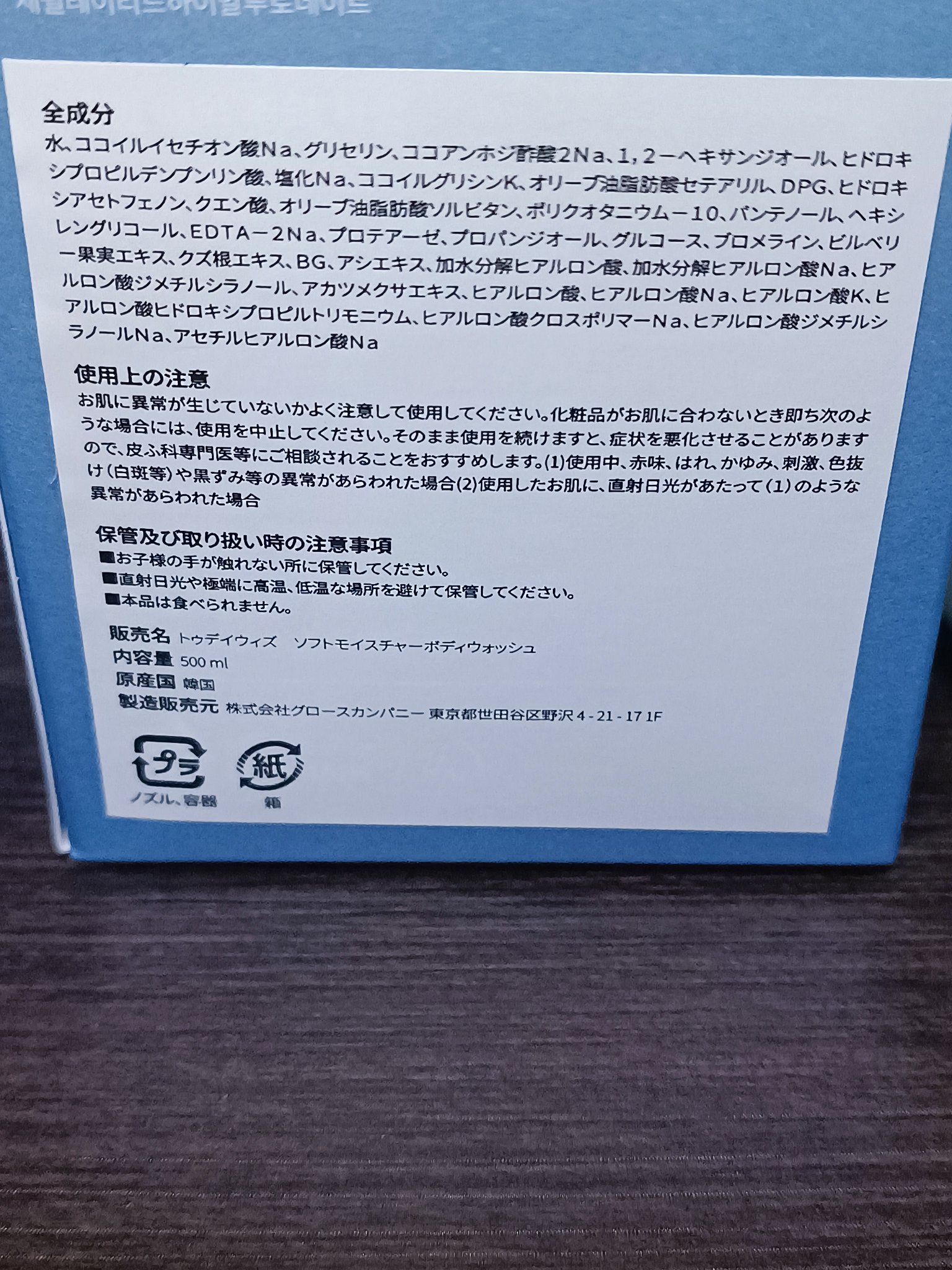- <ソフトモイスチャーボディウォッシュ> 水、ココイルイセチオン酸Na、グリセリン、ココアンホジ酢酸2Na、1,2-ヘキサンジオール、ヒドロキシプロピルデンプンリン酸、塩化Na、ココイルグリシンK、オリーブ油脂肪酸セテアリル、DPG、ヒドロキシアセトフェノン、クエン酸、オリーブ油脂肪酸ソルビタン、ポリクオタニウム-10、パンテノール、ヘキシレングリコール、EDTA-2Na、プロテアーゼ、プロパンジオール、グルコース、ブロメライン、ビルベリー果実エキス、クズ根エキス、BG、アシエキス、加水分解ヒアルロン酸、加水分解ヒアルロン酸Na、ヒアルロン酸ジメチルシラノール、アカツメクサエキス、ヒアルロン酸、ヒアルロン酸Na、ヒアルロン酸K、ヒアルロン酸ヒドロキシプロピルトリモニウム、ヒアルロン酸クロスポリマーNa、ヒアルロン酸ジメチルシラノールNa、アセチルヒアルロン酸Na
