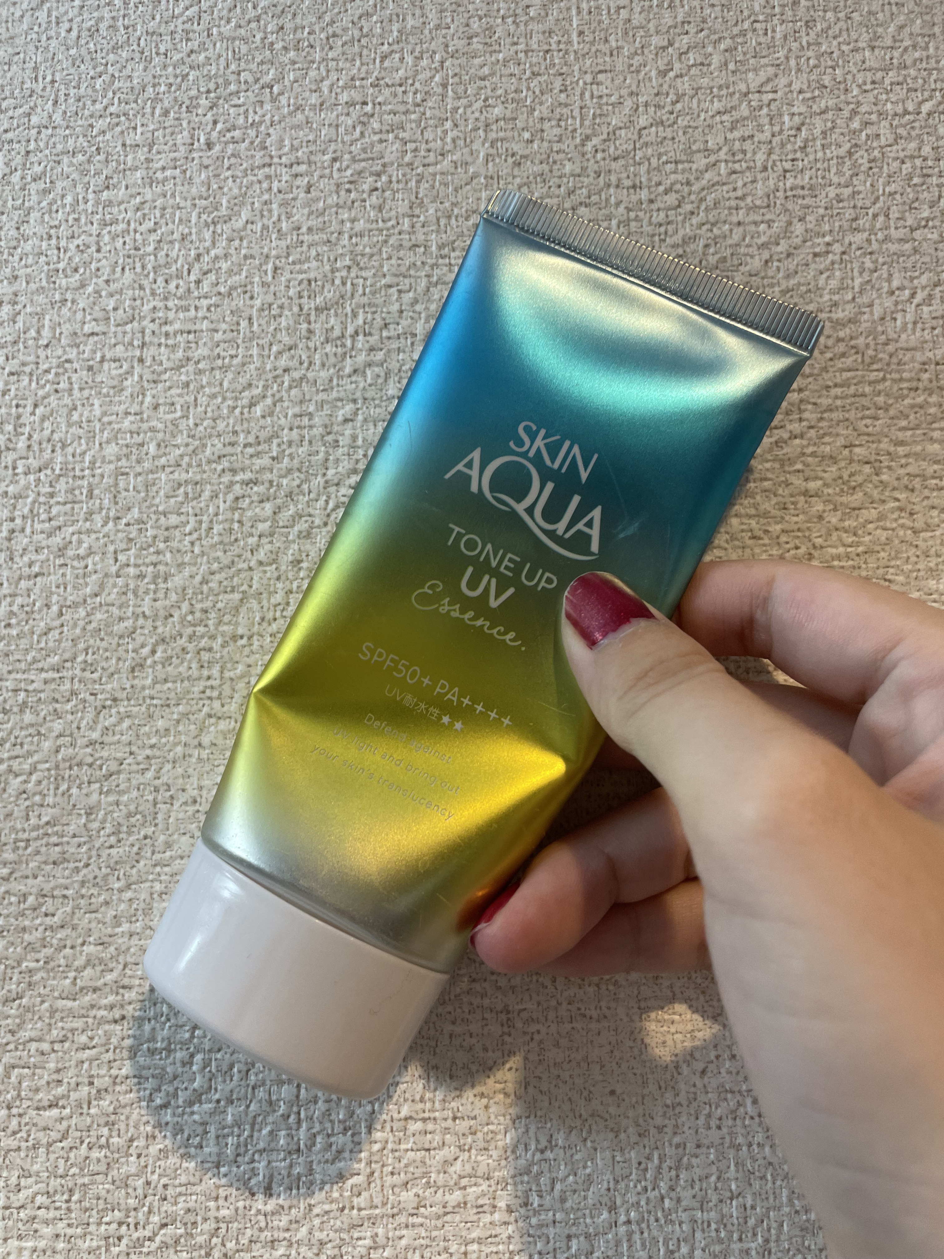 スキンアクアトーンアップUVエッセンスローズローズ初めて使いました!ラベンダーとグリーンは使ったことがあって、日焼け止めや化粧下地はラベンダーを買うことが多いけど、ローズは自然にトーンアップして顔色が良く見えるので良いなと思いました😍白くなり...