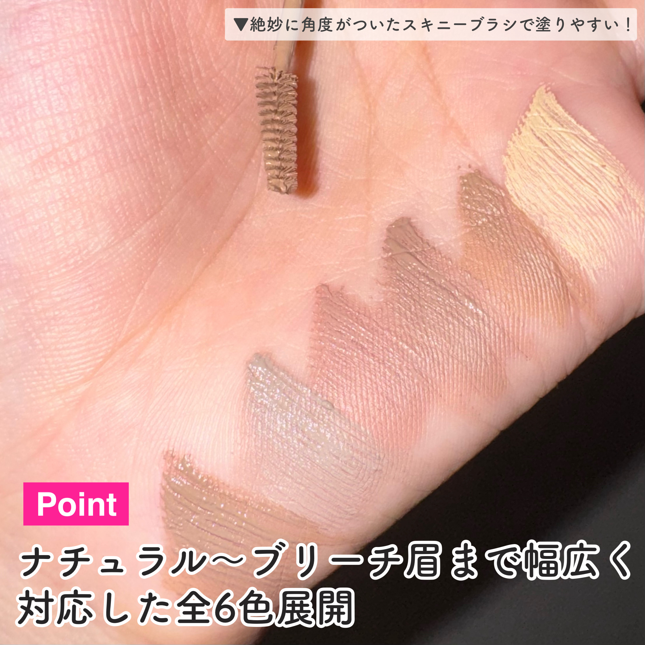 - 薄いタッチでもムラを防いで高発色し、ナチュラルからブリーチまで幅広いカラーを揃え、素早くフィクシングしてにじみにくく、スキニーブラシで繊細に仕上げられるアイブロウカラー