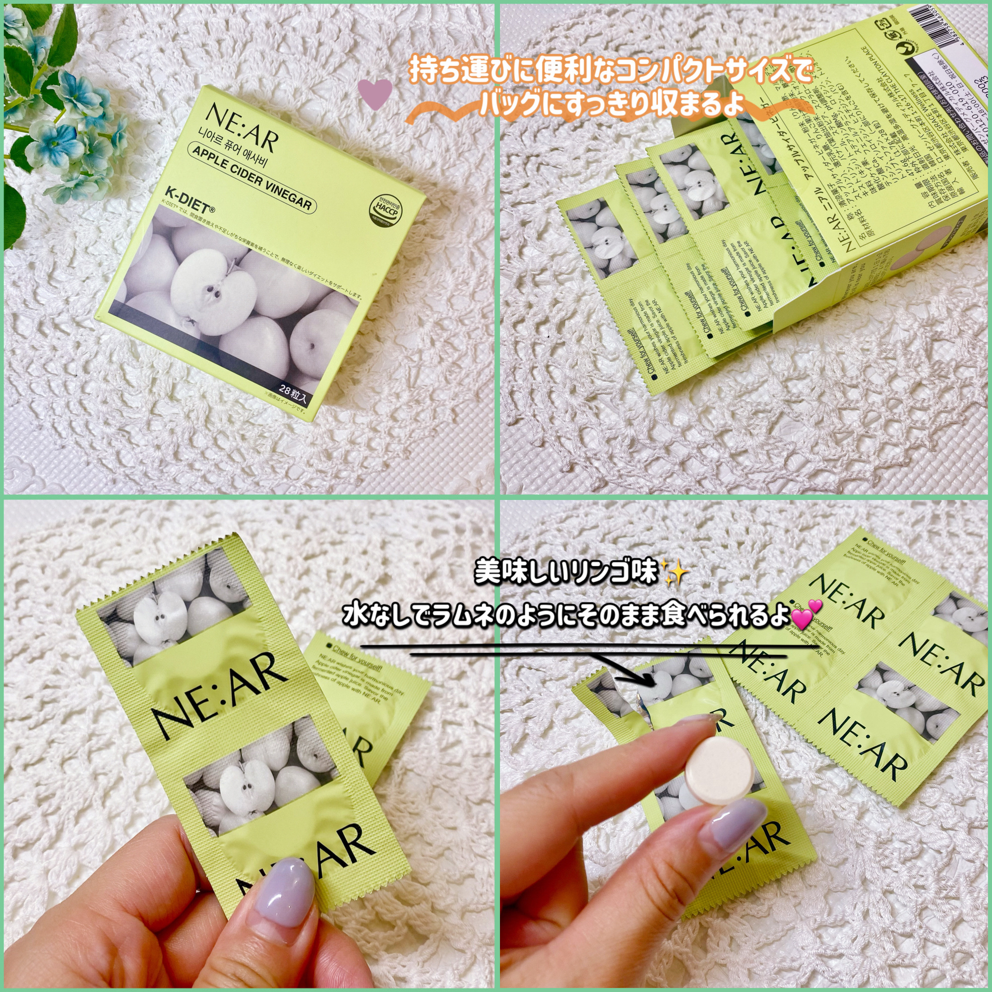 - 噛んで摂る韓国流タブレット型サプリ。韓国で健康サポート成分として人気急上昇中のアップルサイダービネガーに加え、体づくりに欠かせない9種の必須アミノ酸やバナバ葉抽出粉末を配合し、日々の健康と美容をサポートします。