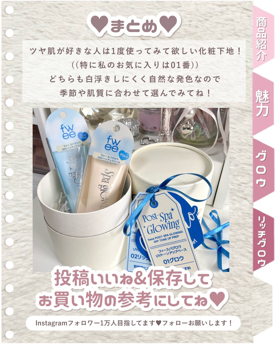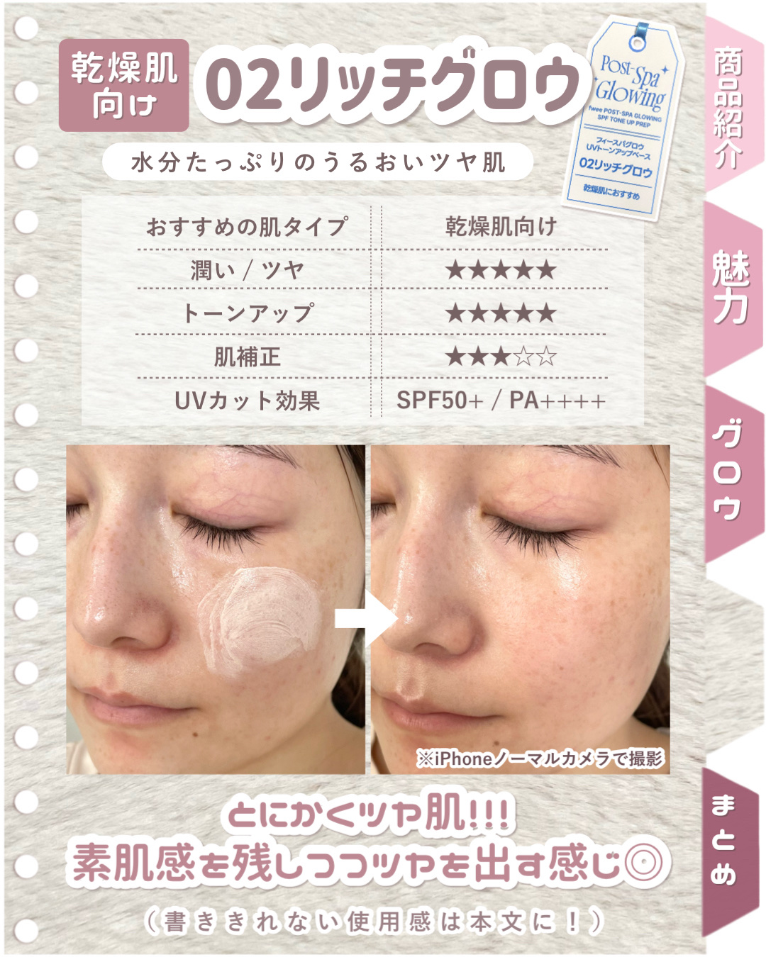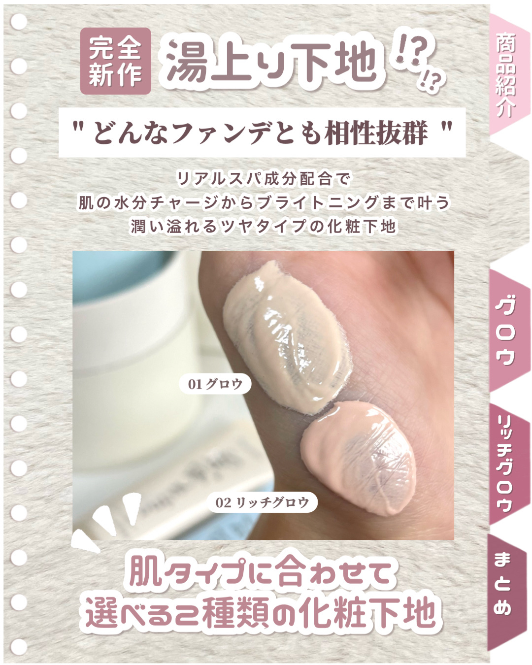 - スパグロウUVトーンアップベースはたったたった一層の差で肌の土台を変える、キメも毛穴も瞬間カバーする私史上最強化粧ノリベースです。 リアルスパ成分配合で、水分チャージから美白ケアまでこれ1つで完結。 理想の仕上がりを追求し、肌タイプに合わせて2種類からお選びいただけます。 01グロウはツヤ肌が好きだけどテカリは苦手で、毛穴までしっかりカバーしたい混合肌の方におすすめ。 02 リッチグロウは乾燥によるメイク崩れにお悩みで軽いのに強力なUVカットまで求める乾燥肌の方におすすめします。 11月1日(土)に開催予定のQoo10メガセールにて、「スパグロウUVトーンアップベース」がついに販売開始