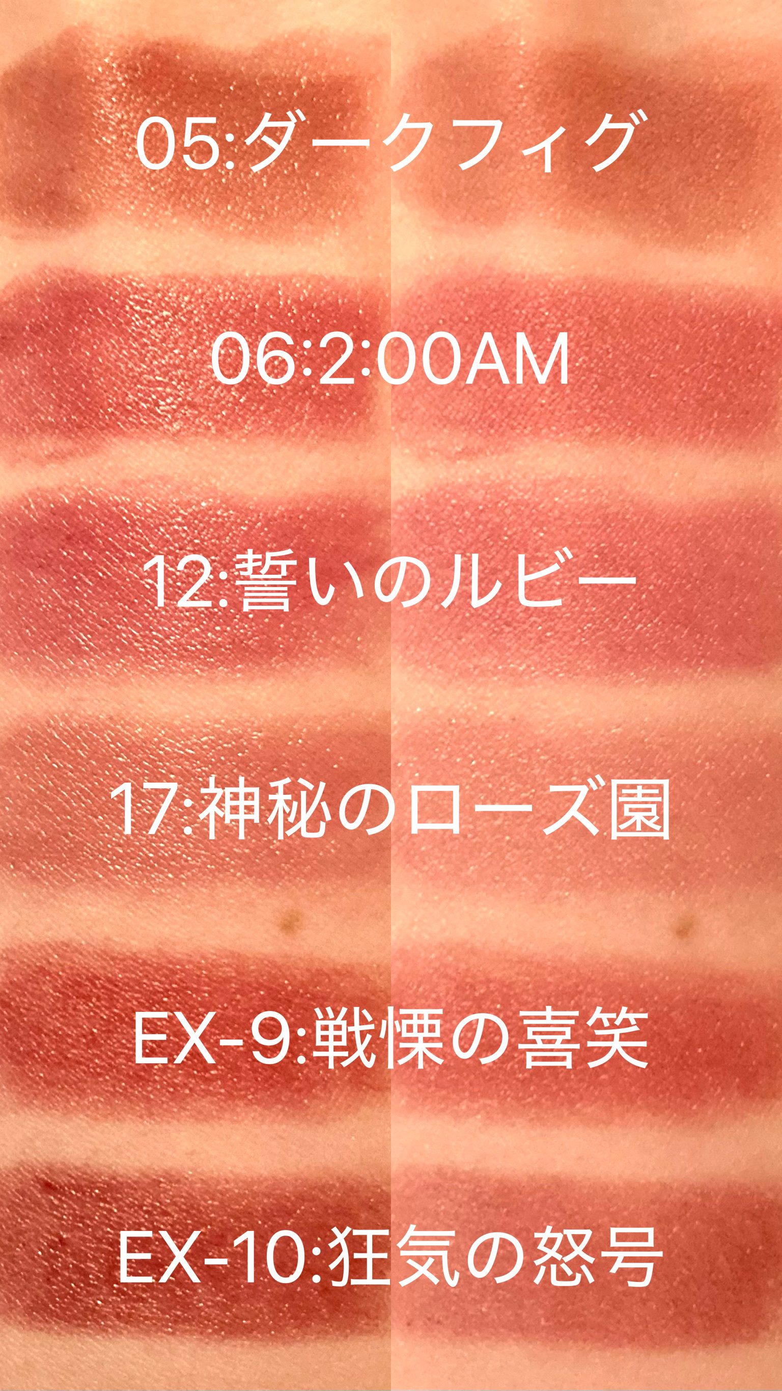 - <01 欲望の塊> テトライソステアリン酸ジペンタエリスリチル、トリ(カプリル酸/カプリン酸)グリセリル、オクチルドデカノール、ラウロイルグルタミン酸ジ(フィトステリル/オクチルドデシル)、ビスアルキル(C16-18)グリセリルウンデシルジメチコン、イソノナン酸イソトリデシル、水添ポリイソブテン、ラウロイルグルタミン酸ジ(オクチルドデシル/フィトステリル/ベヘニル)、パラフィン、合成ワックス、ダイマージリノール酸(フィトステリル/イソステアリル/セチル/ステアリル/ベヘニル)、マイクロクリスタリンワックス、水添マイクロクリスタリンワックス、ヒドロキシステアリン酸エチルヘキシル、トコフェロール、ホホバ種子油、オリーブ果実油、アーモンド油、(エチレン/プロピレン)コポリマー、ポリエチレン、ジメチコン、(+/-)(チタン/酸化チタン)焼結物、マイカ、ラウロイルアスパラギン酸Na、ラウロイルリシン、塩化亜鉛、酸化チタン、酸化鉄、水酸化Al、硫酸Ba、トリイソステアリン酸イソプロピルチタン、酸化スズ、ホウケイ酸(Ca/Al)、合成フルオロフロゴパイト、黄4、黄5、赤104(1)、赤201、赤202 <02 ピンクバナナ> テトライソステアリン酸ジペンタエリスリチル、トリ(カプリル酸/カプリン酸)グリセリル、オクチルドデカノール、ラウロイルグルタミン酸ジ(フィトステリル/オクチルドデシル)、ビスアルキル(C16-18)グリセリルウンデシルジメチコン、イソノナン酸イソトリデシル、水添ポリイソブテン、ラウロイルグルタミン酸ジ(オクチルドデシル/フィトステリル/ベヘニル)、パラフィン、合成ワックス、ダイマージリノール酸(フィトステリル/イソステアリル/セチル/ステアリル/ベヘニル)、マイクロクリスタリンワックス、水添マイクロクリスタリンワックス、ヒドロキシステアリン酸エチルヘキシル、トコフェロール、ホホバ種子油、オリーブ果実油、アーモンド油、(エチレン/プロピレン)コポリマー、ポリエチレン、ジメチコン、(+/-)(チタン/酸化チタン)焼結物、マイカ、ラウロイルアスパラギン酸Na、ラウロイルリシン、塩化亜鉛、酸化チタン、酸化鉄、水酸化Al、硫酸Ba、トリイソステアリン酸イソプロピルチタン、酸化スズ、ホウケイ酸(Ca/Al)、合成フルオロフロゴパイト、黄4、黄5、赤104(1)、赤201、赤202 <03 陽炎> テトライソステアリン酸ジペンタエリスリチル、トリ(カプリル酸/カプリン酸)グリセリル、オクチルドデカノール、ラウロイルグルタミン酸ジ(フィトステリル/オクチルドデシル)、ビスアルキル(C16-18)グリセリルウンデシルジメチコン、イソノナン酸イソトリデシル、水添ポリイソブテン、ラウロイルグルタミン酸ジ(オクチルドデシル/フィトステリル/ベヘニル)、パラフィン、合成ワックス、ダイマージリノール酸(フィトステリル/イソステアリル/セチル/ステアリル/ベヘニル)、マイクロクリスタリンワックス、水添マイクロクリスタリンワックス、ヒドロキシステアリン酸エチルヘキシル、トコフェロール、ホホバ種子油、オリーブ果実油、アーモンド油、(エチレン/プロピレン)コポリマー、ポリエチレン、ジメチコン、(+/-)(チタン/酸化チタン)焼結物、マイカ、ラウロイルアスパラギン酸Na、ラウロイルリシン、塩化亜鉛、酸化チタン、酸化鉄、水酸化Al、硫酸Ba、トリイソステアリン酸イソプロピルチタン、酸化スズ、ホウケイ酸(Ca/Al)、合成フルオロフロゴパイト、黄4、黄5、赤104(1)、赤201、赤202 <04 パンプキンワイン> テトライソステアリン酸ジペンタエリスリチル、トリ(カプリル酸/カプリン酸)グリセリル、オクチルドデカノール、ラウロイルグルタミン酸ジ(フィトステリル/オクチルドデシル)、ビスアルキル(C16-18)グリセリルウンデシルジメチコン、イソノナン酸イソトリデシル、水添ポリイソブテン、ラウロイルグルタミン酸ジ(オクチルドデシル/フィトステリル/ベヘニル)、パラフィン、合成ワックス、ダイマージリノール酸(フィトステリル/イソステアリル/セチル/ステアリル/ベヘニル)、マイクロクリスタリンワックス、水添マイクロクリスタリンワックス、ヒドロキシステアリン酸エチルヘキシル、トコフェロール、ホホバ種子油、オリーブ果実油、アーモンド油、(エチレン/プロピレン)コポリマー、ポリエチレン、ジメチコン、(+/-)(チタン/酸化チタン)焼結物、マイカ、ラウロイルアスパラギン酸Na、ラウロイルリシン、塩化亜鉛、酸化チタン、酸化鉄、水酸化Al、硫酸Ba、トリイソステアリン酸イソプロピルチタン、酸化スズ、ホウケイ酸(Ca/Al)、合成フルオロフロゴパイト、黄4、黄5、赤104(1)、赤201、赤202 <05 ダークフィグ> テトライソステアリン酸ジペンタエリスリチル、トリ(カプリル酸/カプリン酸)グリセリル、オクチルドデカノール、ラウロイルグルタミン酸ジ(フィトステリル/オクチルドデシル)、ビスアルキル(C16-18)グリセリルウンデシルジメチコン、イソノナン酸イソトリデシル、水添ポリイソブテン、ラウロイルグルタミン酸ジ(オクチルドデシル/フィトステリル/ベヘニル)、