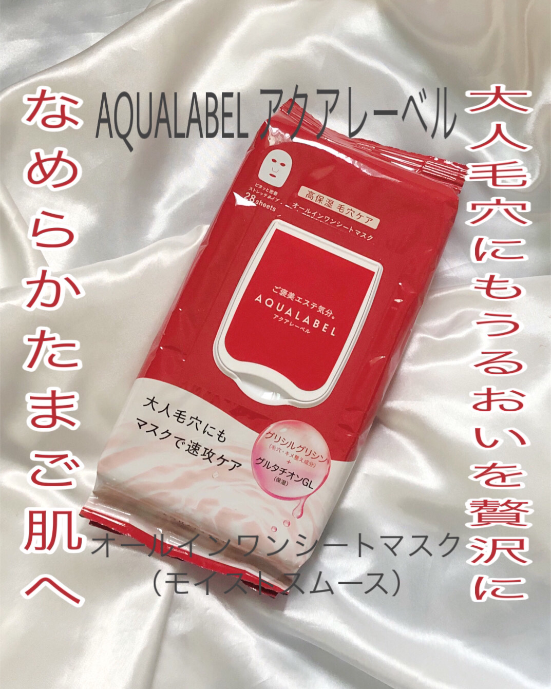 - 限定発売 グリシルグリシン+グルタチオン GL 配合 アクアレーベルから大人毛穴まで速攻ケアするシートマスクが新登場 成分重視派の本格毛穴ケアマスク。 たっぷりのうるおいを与え、毛穴の目立たないなめらかたまご肌へ。 〇大人毛穴までアプローチ!毛穴・キメ整え成分 グリシルグリシン配合 〇グルタチオン GL(グルタチオン、グリセリン/保湿)配合 〇トリメチルグリシン GL(ベタイン、グリセリン/保湿)配合 〇コラーゲン GL(水溶性コラーゲン、グリセリン/保湿)配合 〇W ヒアルロン酸(アセチル化ヒアルロン酸 Na、ヒアルロン酸 Na/保湿)配合 〇美肌に導く 浸透美容アミノ酸(D-グルタミン酸、DL-アラニン、DL-メチオニン/うるおい保持)配合 〇1 品 5 機能(ふきとり洗顔/化粧水/乳液/美容液/マスク) 〇ピタッと密着するストレッチシート 〇気持ちに寄り添う、ハーバルローズの香り 〇アレルギーテスト済み(全ての方にアレルギーが起きないというわけではありません。) 販売チャネル ドラッグストアの一部企業で限定販売