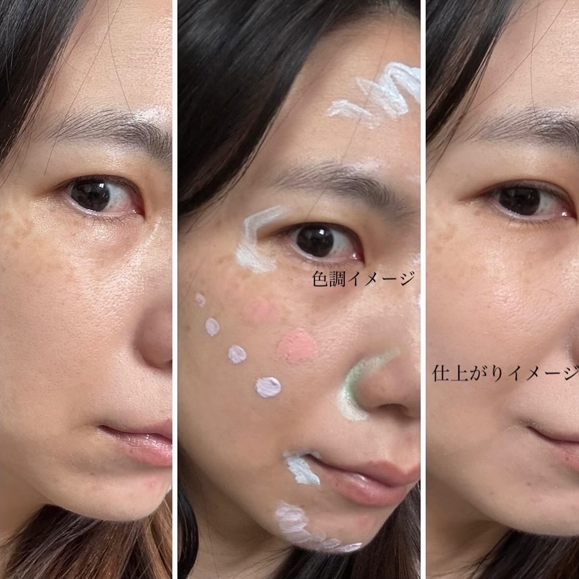 沈み込むタイプのやわらかいスポンジです。チョンととるだけでいいカバー力なので、ふたの裏でつける量を調節。 頬の高い部分から伸ばし、外側へ伸ばしていきます。さらにカバーしたい悩みのあるところに、重ねつけ。 ①オークル やや明るめ〜中間的な明るさ ナチュラルで落ち着いたカラー。暗めの色合いなのでパウダーで調節しています。