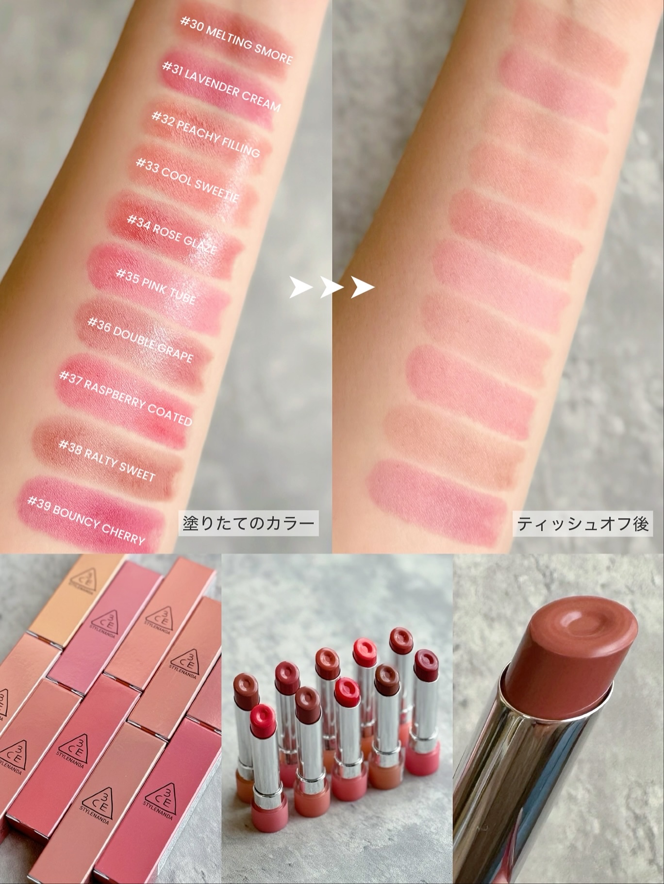 3CEの新作リップ&チークがデイリーで使える10色から選べて、保湿力抜群のツヤだから秋冬のリップに超おすすめ(´x`)パケも可愛くて持ち運びたくなるお気に入りは32♡#PR#3CE#コムハニーリップって呼ばれてるよ‼︎#深みリップに恋する季節...