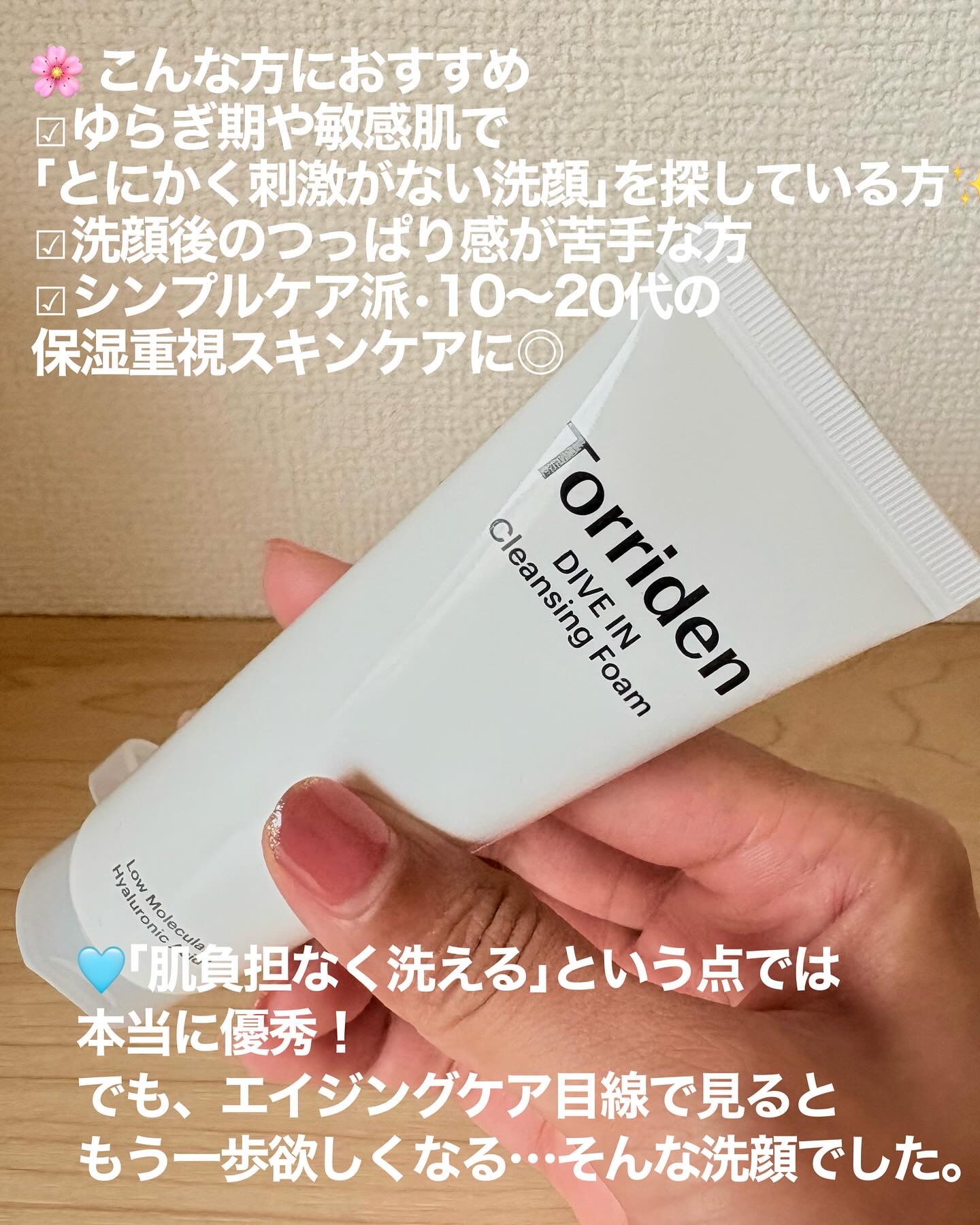 生理前など肌がゆらぎやすい時期にもやさしく使える洗顔料を探し中🔍️いつもはdプログラムを愛用しているけど人気のダイブインシリーズから出ているこちらをコスパ良さそうなので使ってみたの🙌✨🫧Torridenダイブインクレンジングフォーム🫧120m...