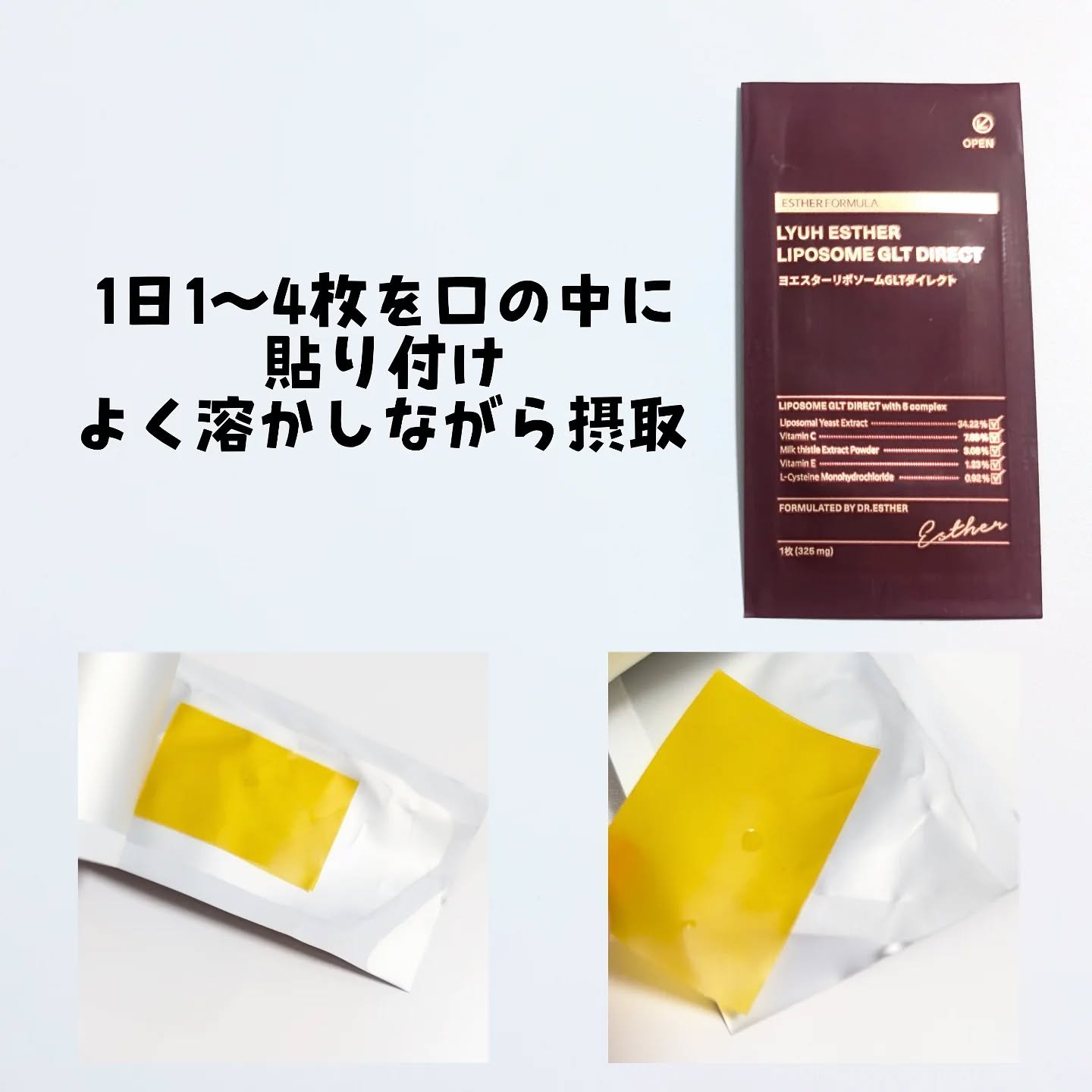進化が止まらない!韓国で話題の貼るグルタチオン*知ってる?リポソーム化グルタチオン*とビタミンC配合のグルタチオン*フィルムでインナーケア💎エスターフォーミュラヨエスターリポソームGLTダイレクトウルトラXお水不要で上顎に貼り付けて溶かすだけ...
