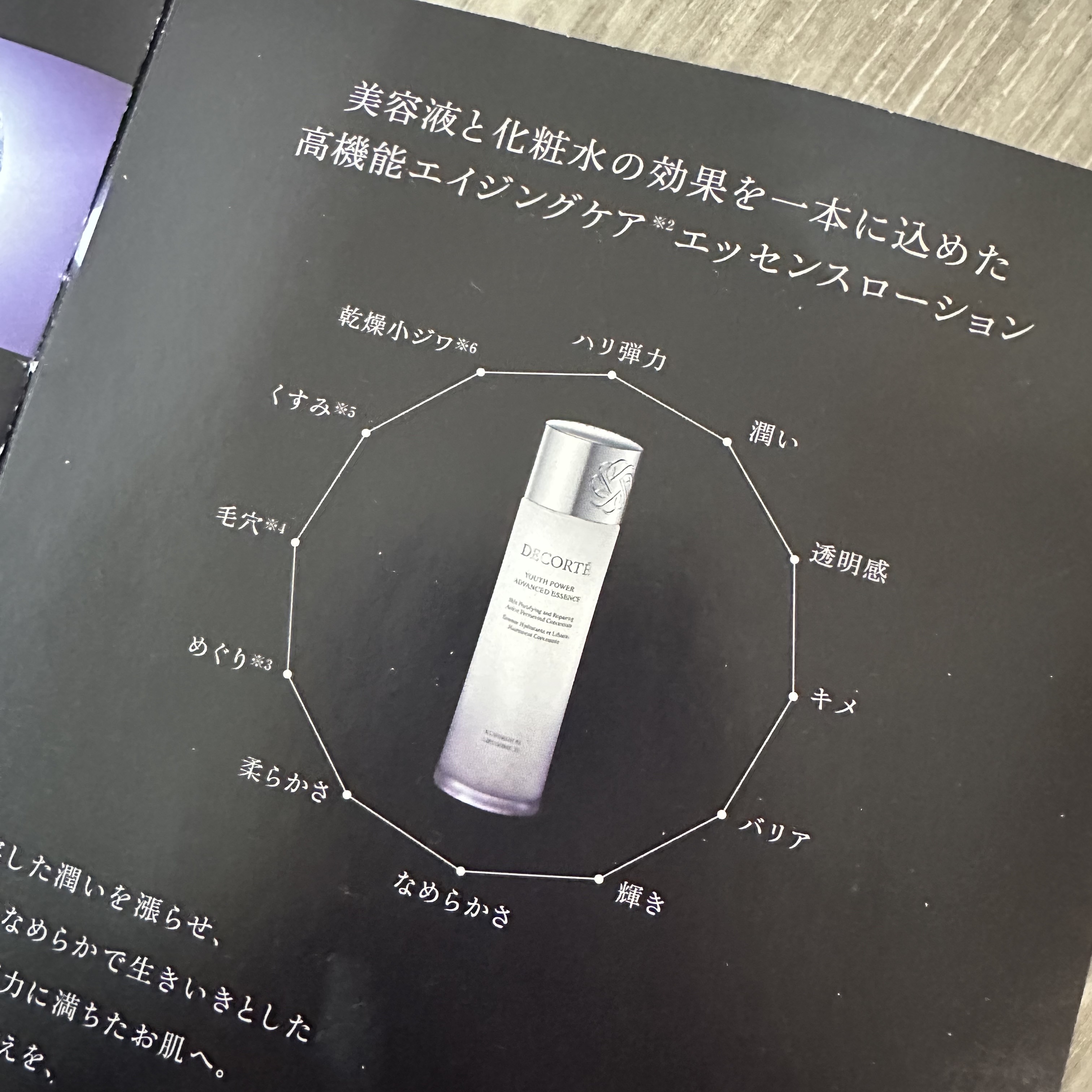 DECORTÉユースパワーエッセンスローション試供品3ml(¥16500/150ml)液はサラッとしているけれど重みがある気がします。肌に乗せるとヌルッと肌に馴染んでいく感じがします。私は1袋を5回ほどで使い切りました。次の日、肌を触るとスベ...