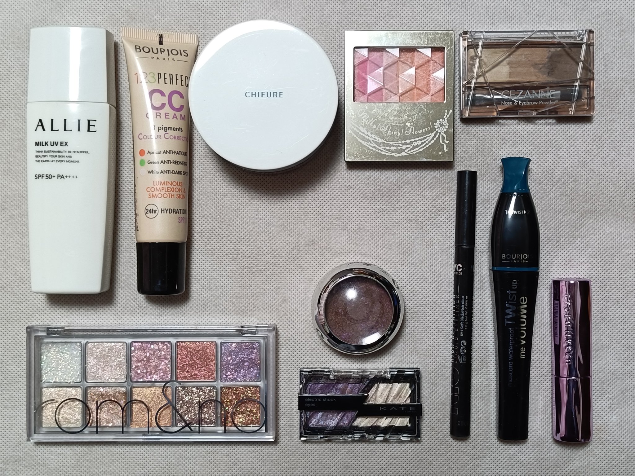 アリィー ニュアンスチェンジUV ジェル RSを、顔全体にまんべんなく塗ります。 RMK RMK ジェルクリーミィファンデーション 103を、顔全体にまんべんなく塗ります。 ジョンソンベビー ジョンソン ベビーパウダーを、顔全体にまんべんなく軽くはたきます。 THE BODY SHOP bronze shade warm glowを、両頬に塗ります。 KATE リフレクトミラーアイズ BR-1の締め色を、眉毛全体にまんべんなく塗ります。 URGLAM UR GLAMBLOOMING EYE COLOR PALETTE 01を、使用しました。 ちふれ リキッド アイライナー 筆ペンタイプ BK30 ブラックを、塗ります。 CEZANNE エアリーカールマスカラを、まつ毛全体にまんべんなく塗ります。 MAYBELLINE NEW YORK コロッサルボリュームエクスプレスを、まつ毛全体にまんべんなく塗ります。 MAYBELLINE NEW YORK SPステイ マットインク 135を、唇全体にまんべんなく塗ります。