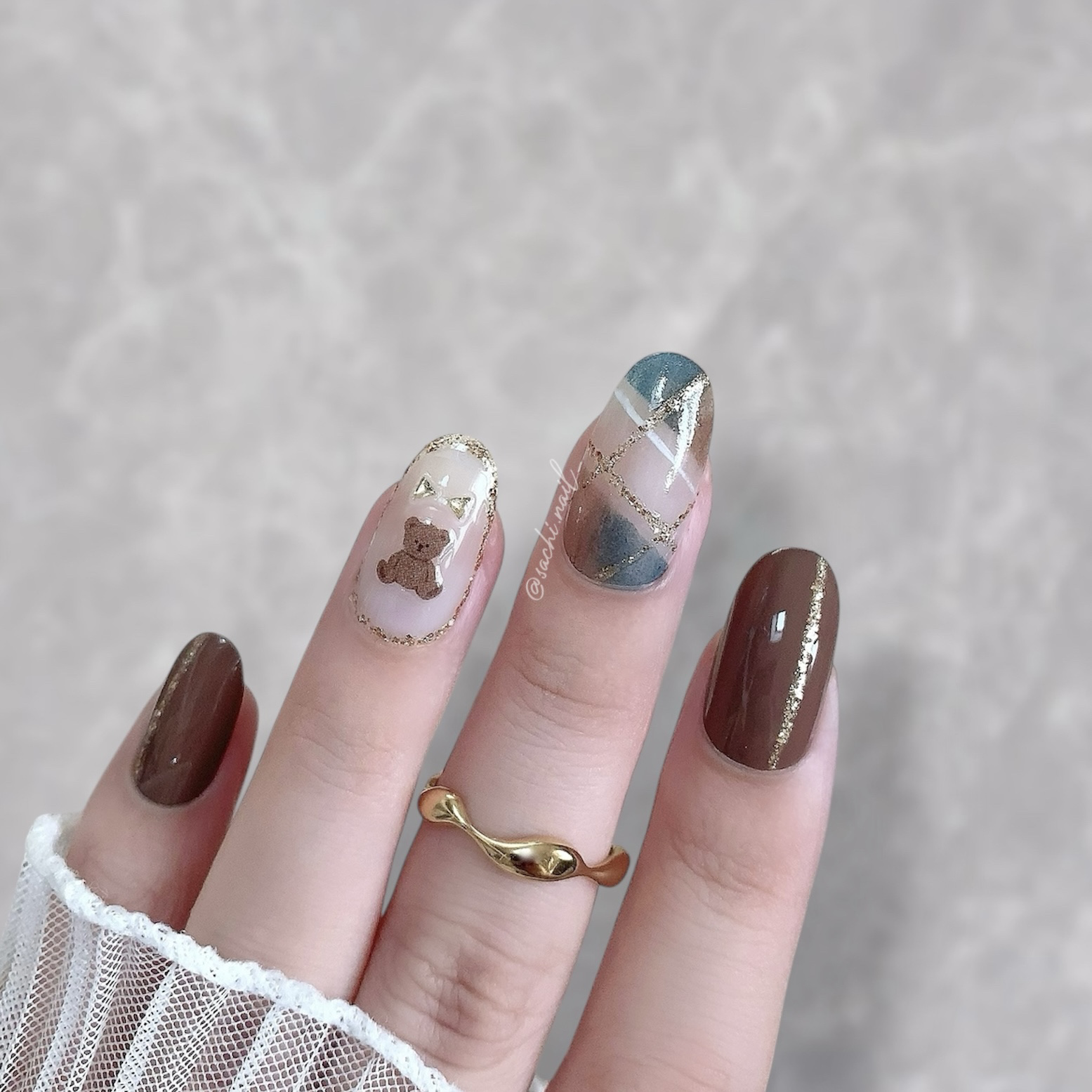 ワンカラーでも指ごとに色を変えるだけでオシャレに見えます💕 画像のようにゴールドラインとストーンを少し足すだけで華やかさがアップ🥰 何度かご紹介したことのあるスポンジで作るグラデーションです✨ スポンジを使うことで境目が綺麗に馴染んでくれます💕 アルミホイルの上でブラウンとトップコートを1:1くらいで混ぜたものを、トップコートのハケに取って3箇所に塗るだけ👌 事前に混ぜたものを塗ることで、爪の上でぼかすより簡単に出来ます💕 ベースカラーが乾く前に点置きしてぼかすことで綺麗にぼかせます✨ スピードが大事なので、使うポリッシュのキャップは全て開けておきましょう😊 天然石のラインはガタガタの方がより天然石っぽく見えるので、ラインを描くのが苦手な方でも大丈夫🙆♀️ 難しそうに見えて、やってみると意外と簡単に出来ます♡