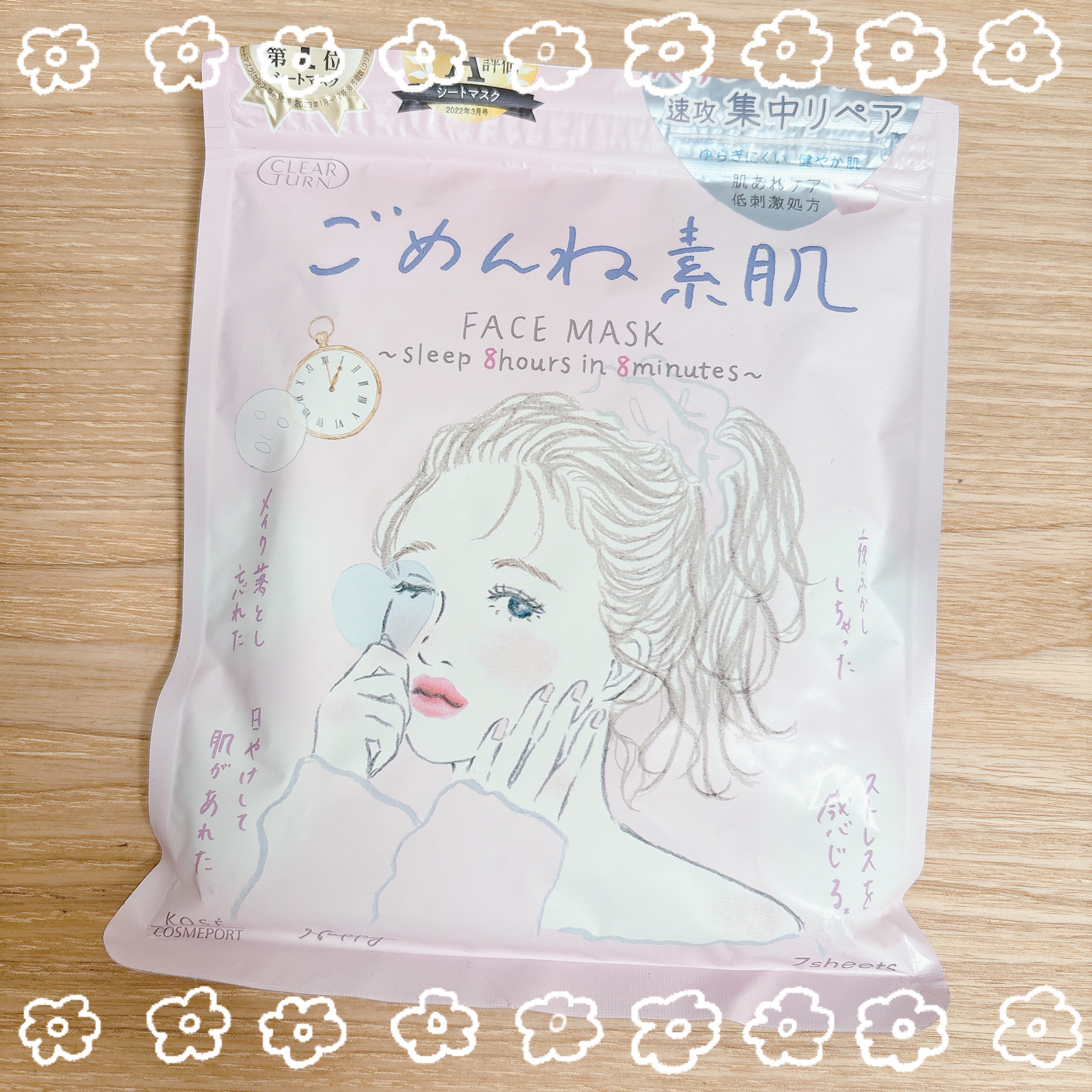 - 【クリアターン ごめんね素肌マスク】 負担をかけて、あれてしまった肌の素肌環境※1をととのえる“速攻集中リペア※2マスク”です。 ① あれがちな肌を素早くコンディションケア! ザクロエキス、桜エキス※3、ウメ果実エキスBG配合し、ゆらぎやすい肌環境をととのえ、肌あれをケアします。また、うるおいケア成分として、ヒアルロン酸、白キクラゲ多糖体BGを配合。外的ストレス※4や不規則な生活の影響を受けやすい肌も健やかでゆらぎにくい肌へみちびきます。 ②敏感肌も使える、弱酸性・低刺激処方 無香料・無着色・無鉱物油・アルコールフリー(エチルアルコール)・パラベンフリー・紫外線吸収剤フリー・シリコーンフリー・パッチテスト済み・アレルギーテスト済み・スティンギングテスト済み・敏感肌自覚者による連用テスト済み(すべての方にアレルギーや皮膚刺激が起きない、刺激感がないというわけではありません。すべての方の肌に合うということではありません。) ③角質ケアもできる!凸凹高密着シート コットン生まれのやわらかな肌触りのベンリーゼを使用。 表面に凸凹のエンボス加工を施しているため、密着性が高く、はがしたマスクでやさしく顔をふきとることで角質ケアもできます。 ※1 うるおい環境のこと ※2 うるおいお手入れのこと ※3 ソメイヨシノ葉エキス、ウメ果実エキスBGはウメ果実エキス・BG(保湿) ※4 乾燥による刺激のこと
