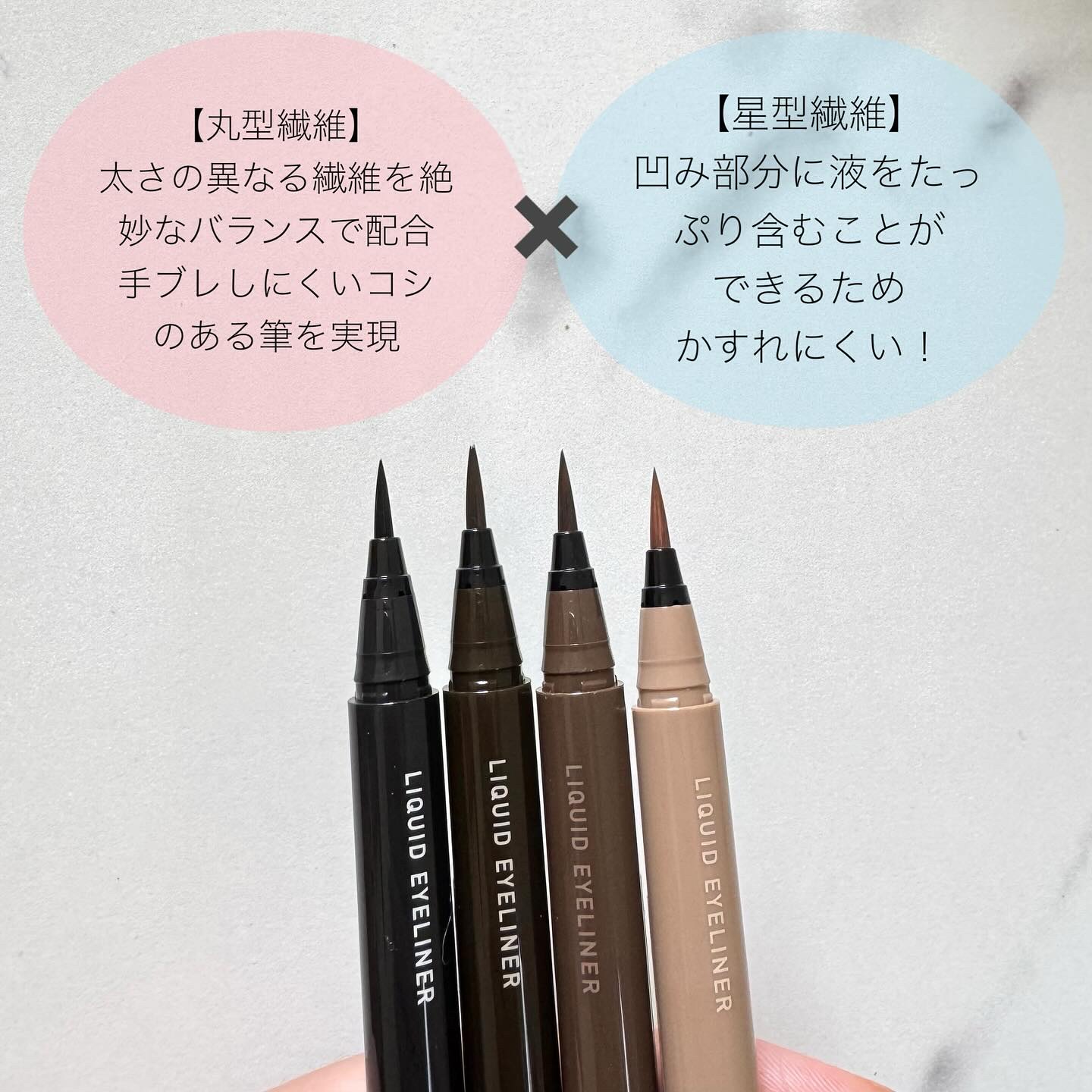 - キングダム リキッドアイライナーTPは、初心者でも、簡単に理想のアイラインが引きやすい「魔法の筆」を採用。ブレにくく描ける安定感とかすれにくく描けることが特長で、日常使いからステージメイクまで幅広く対応します。 さらに、落ちにくさも強化*。「こすれプルーフ」を含む3つのプルーフ処方へと進化*しました。 Point 1:誰でもプロ級!ブレにくい × かすれにくい「魔法の筆」 「ブレにくく描ける」丸形センイと、「かすれにくく描ける」星形センイをブレンドし、0.1mmの極細ラインもなめらかに描けます。 ●【丸形センイ:ブレにくい】太さの異なるセンイを絶妙なバランスで配合。手ブレしにくい、コシのある筆を実現! ●【星形センイ:かすれにくい】凹み部分に液をたっぷり含むことができるため、かすれにくい! Point 2:涙・皮脂・こすれに強い!3つのプルーフ処方 ①涙・水・汗に強い:ウォータープルーフ ②皮脂に強い:スマッジプルーフ ③こすれに強い:こすれプルーフ <ブラウン> 自然な目力 王道ブラウン。 <ブラック> 強すぎない絶妙ブラック。 <ブラックブラウン> 黒の目力×茶の柔らかさを兼ねそろえた黒みブラウン。 <ラテブラウン> 柔らか盛れ まろみラテブラウン。 *自社従来品との比較