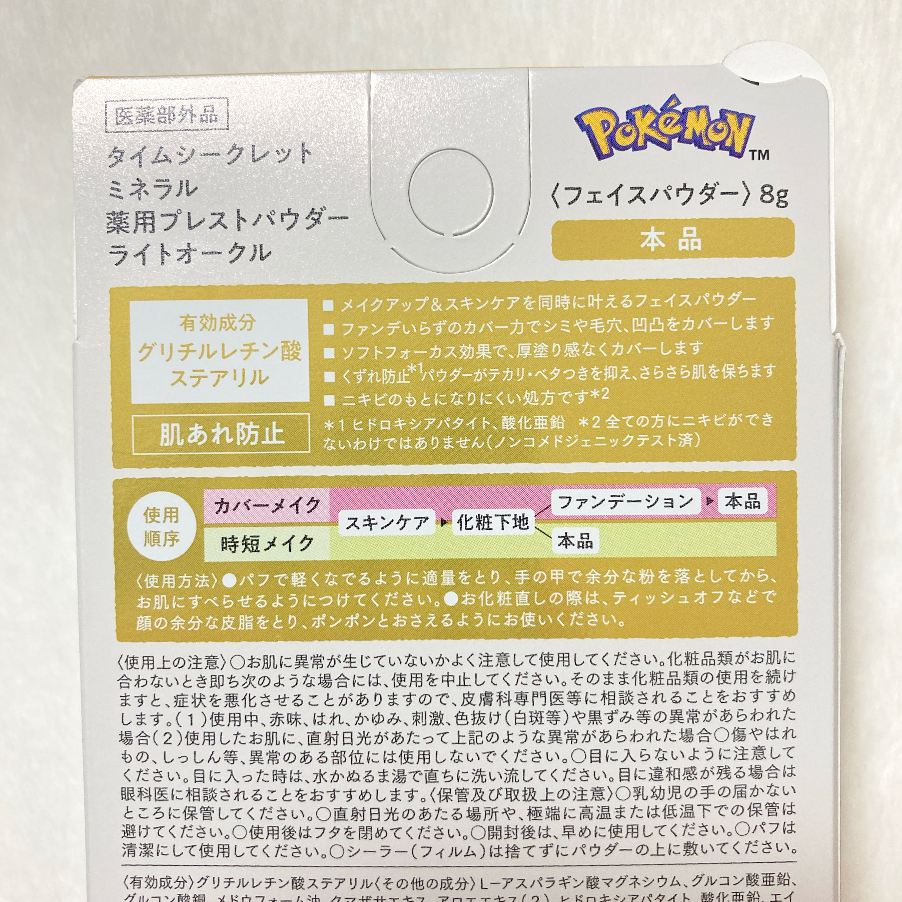 TIMESECRETよりポケモンデザインでミネラル薬用プレストパウダー✨️ピカチュウのケースがシンプルだけど可愛い🥰優しい色使いのせいか、悪目立ちしないので持ち運びにしても良さそうです👍️石けんで落とせるのが嬉しい、肌への負担少なさそうなプレ...