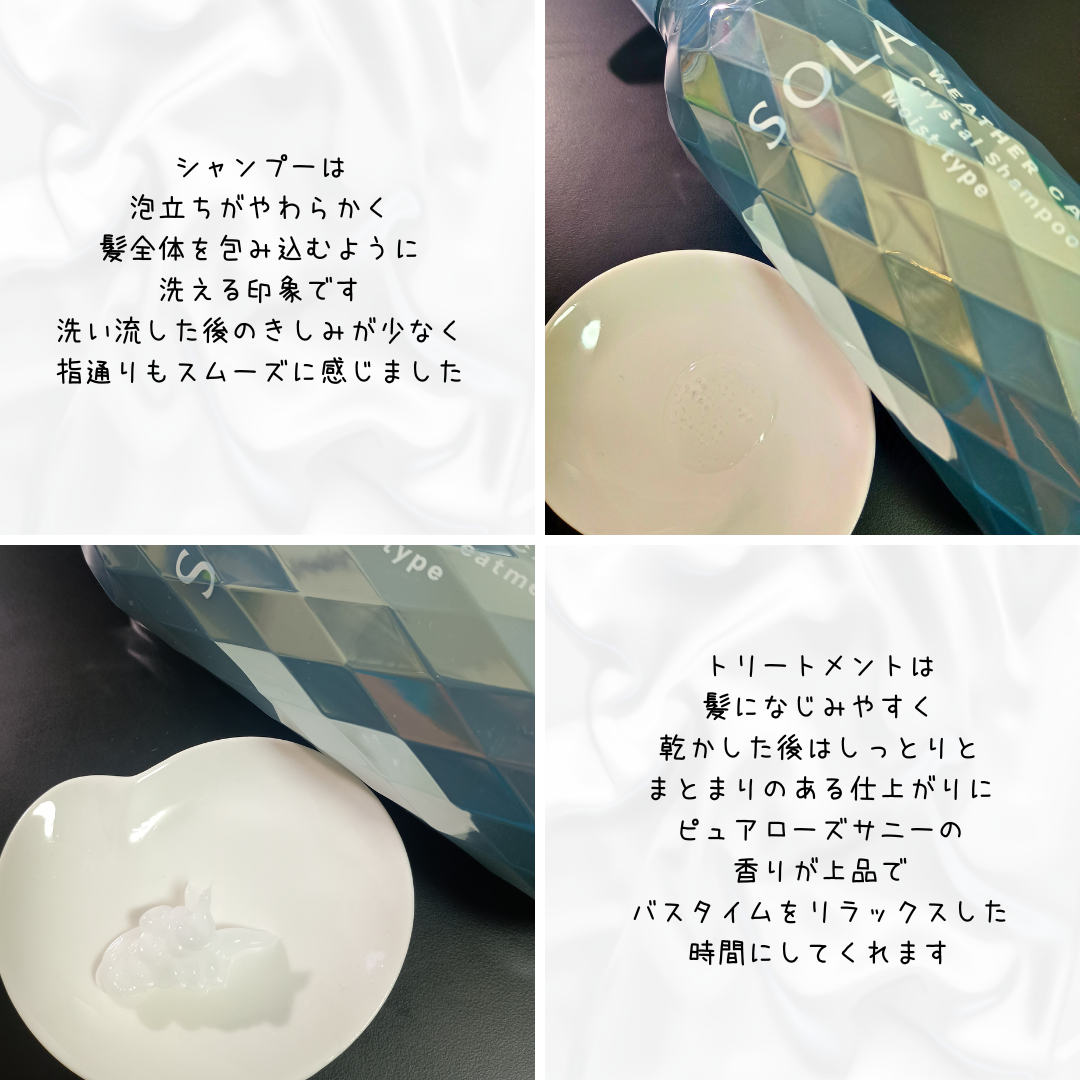 SOLAWEATHERCARE(ソラ ウェザーケア) クリスタルシャンプー/ヘアトリートメント モイストタイプを試してみました🤗SOLAWEATHERCARE(ソラウェザーケア)クリスタルシャンプー/ヘアトリートメントモイストタイプは、天候に...
