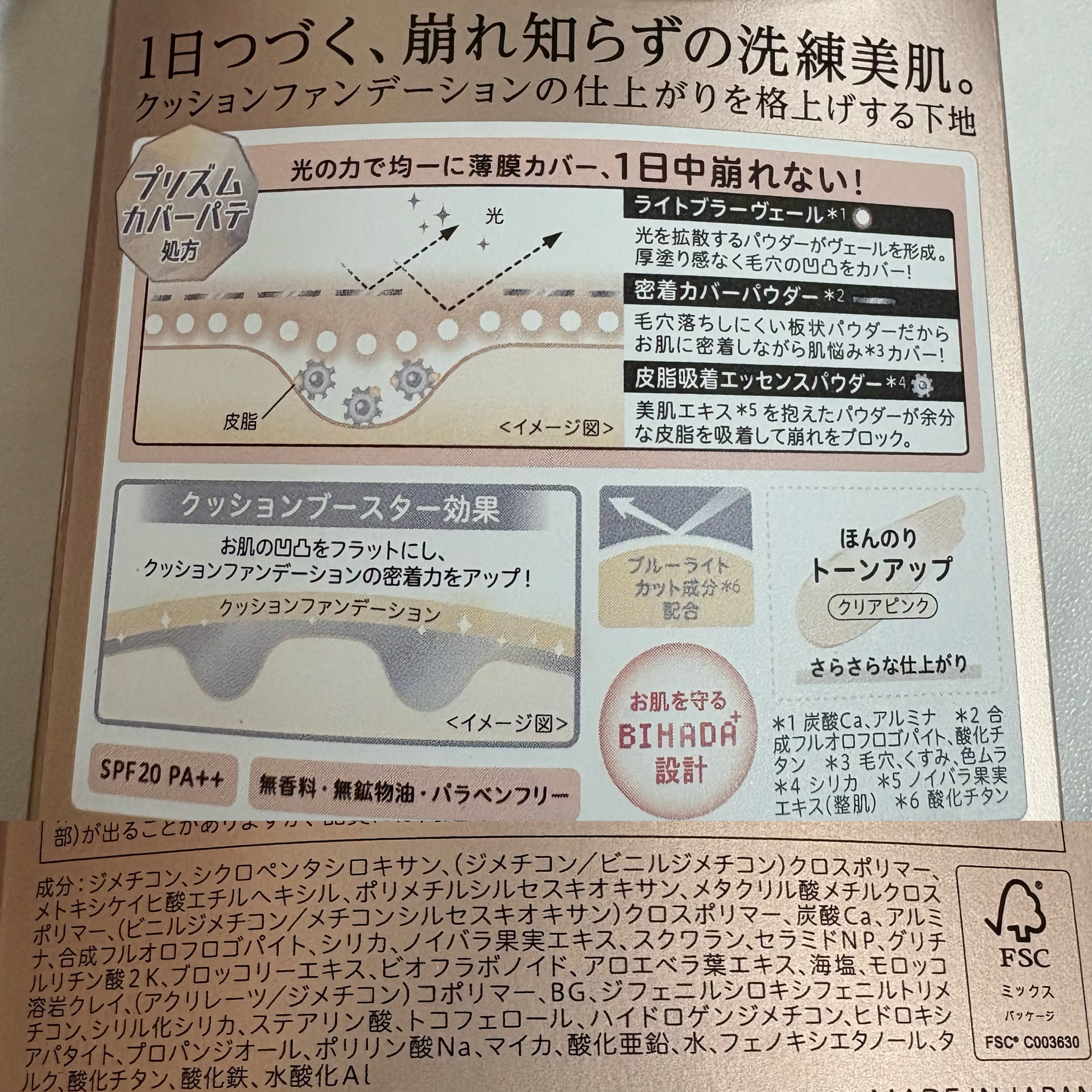 - 凹凸のある毛穴を均一に整え、クッションファンデーションとの密着力を高める化粧下地 SPF20・PA++ 先行発売日:2024年7月23日(火)~ 自社ECサイト、一部店舗にて先行発売