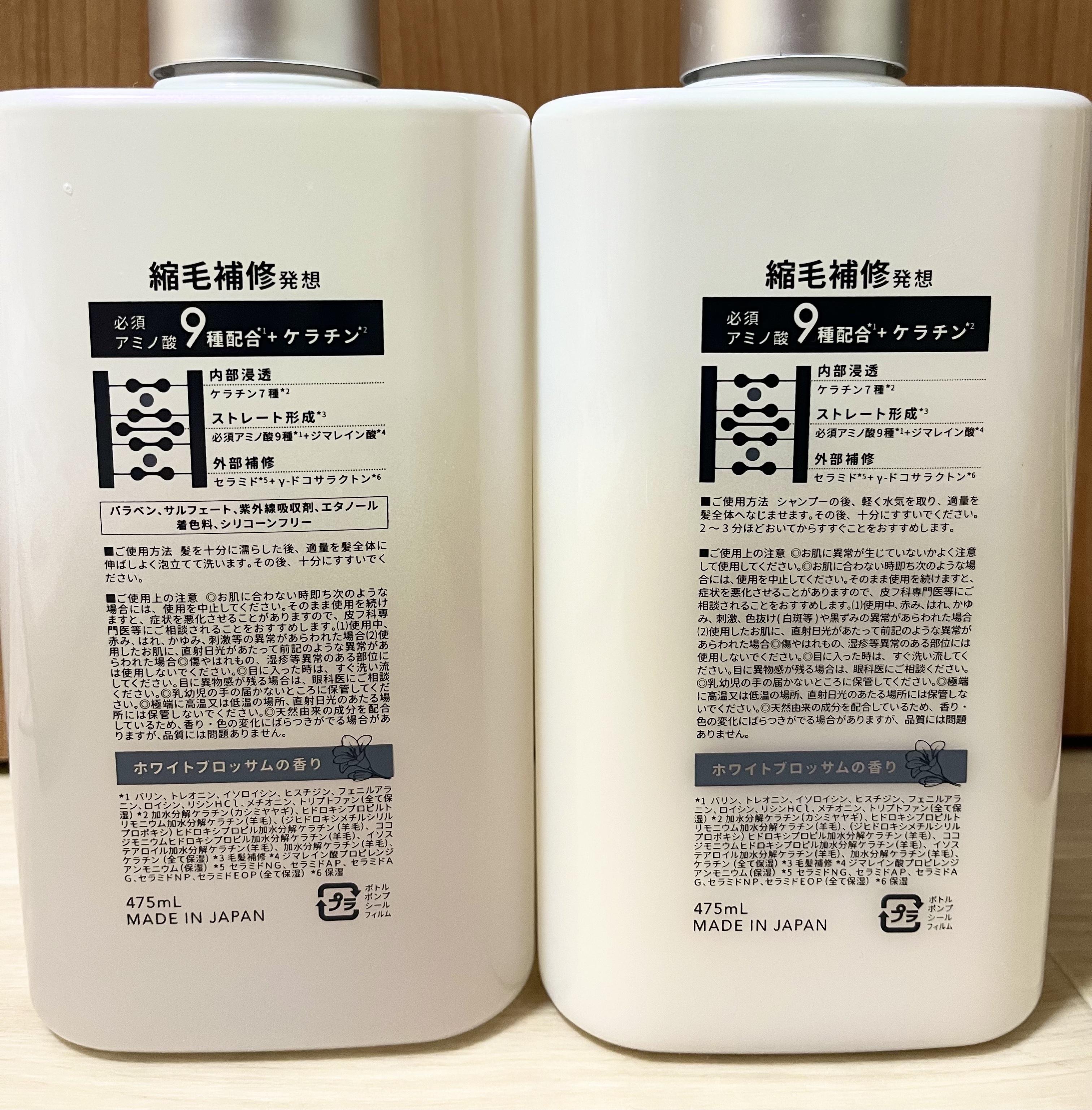 - <シャンプー> 水、コカミドプロピルベタイン、ラウラミドDEA、ラウリルグリコール酢酸Na、ココイル加水分解ケラチンK(羊毛)、ココイルメチルタウリンNa、ココイルグリシンNa、グリチルリチン酸2K、アラントイン、加水分解ケラチン(カシミヤヤギ)、加水分解ケラチン(羊毛)、加水分解シルク、ジマレイン酸プロピレンジアンモニウム、アミノエチルチオコハク酸ジアンモニウム、シスチン、グルタミン酸、アルギニン、リシンHCl、トレオニン、セリン、プロリン、ロイシン、バリン、アスパラギン酸、イソロイシン、グリシン、アラニン、フェニルアラニン、ヒスチジンHCl、メチオニン、トリプトファン、ヒドロキシプロピルトリモニウム加水分解ケラチン(羊毛)、(ジヒドロキシメチルシリルプロポキシ)ヒドロキシプロピル加水分解ケラチン(羊毛)、ココジモニウムヒドロキシプロピル加水分解ケラチン(羊毛)、イソステアロイル加水分解ケラチン(羊毛)、ケラチン、セラミドNP、セラミドNG、セラミドAP、セラミドEOP、セラミドAG、セテアラミドエチルジエトニウム加水分解コメタンパク、ラノリン脂肪酸、γ-ドコサラクトン、スイゼンジノリ多糖体、ヒスチジン、フィトステロールズ、PCA-Na、トリ(カプリル酸/カプリン酸)グリセリル、水添レシチン、グリセリン、BG、タウリン、ヤシ油脂肪酸PEG-7グリセリル、ポリクオタニウムー7、ポリクオタニウムー10、ヒドロキシプロピルシクロデキストリン、エチドロン酸、クエン酸、ブチルカルバミン酸ヨウ化プロピニル、エチドロン酸4Na、EDTA-4Na、イソノナン酸イソノニル、乳酸Na、ラウラミノプロピオン酸Na、PCA、塩化アンモニウム、香料、フェノキシエタノール <トリートメント> 水、セテアリルアルコール、アモジメチコン、ダイマージリノール酸水添ヒマシ油、BG、ベヘントリモニウムクロリド、加水分解シルク、加水分解ケラチン(カシミヤヤギ)、アミノエチルチオコハク酸ジアンモニウム、γ-ドコサラクトン、セテアラミドエチルジエトニウム加水分解コメタンパク、ラノリン脂肪酸、ジグルコシル没食子酸、ジマレイン酸プロピレンジアンモニウム、シスチン、グルタミン酸、アルギニン、リシンHCl、トレオニン、セラミドNG、セラミドAP、セラミドAG、セラミドNP、セラミドEOP、スイゼンジノリ多糖体、セリン、プロリン、ロイシン、バリン、アスパラギン酸、イソロイシン、グリシン、アラニン、フェニルアラニン、ヒスチジンHCl、メチオニン、トリプトファン、グリチルリチン酸2K、アラントイン、ヒドロキシプロピルトリモニウム加水分解ケラチン(羊毛)、(ジヒドロキシメチルシリルプロポキシ)ヒドロキシプロピル加水分解ケラチン(羊毛)、ココジモニウムヒドロキシプロピル加水分解ケラチン(羊毛)、イソステアロイル加水分解ケラチン(羊毛)、加水分解ケラチン(羊毛)、ケラチン、ヒスチジン、フィトステロールズ、PCA-Na、乳酸Na、ラウラミノプロピオン酸Na、PCA、クエン酸、ヒドロキシプロピルデンプンリン酸、イソプロパノール、トリ(カプリル酸/カプリン酸)グリセリル、グリセリン、イソノナン酸イソノニル、水添レシチン、タウリン、セトリモニウムクロリド、塩化アンモニウム、香料、フェノキシエタノール <シャンプー(詰め替え) 400mL> 水、コカミドプロピルベタイン、ラウラミドDEA、ラウリルグリコール酢酸Na、ココイル加水分解ケラチンK(羊毛)、ココイルメチルタウリンNa、ココイルグリシンNa、グリチルリチン酸2K、アラントイン、加水分解ケラチン(カシミヤヤギ)、加水分解ケラチン(羊毛)、加水分解シルク、ジマレイン酸プロピレンジアンモニウム、アミノエチルチオコハク酸ジアンモニウム、シスチン、グルタミン酸、アルギニン、リシンHCl、トレオニン、セリン、プロリン、ロイシン、バリン、アスパラギン酸、イソロイシン、グリシン、アラニン、フェニルアラニン、ヒスチジンHCl、メチオニン、トリプトファン、ヒドロキシプロピルトリモニウム加水分解ケラチン(羊毛)、(ジヒドロキシメチルシリルプロポキシ)ヒドロキシプロピル加水分解ケラチン(羊毛)、ココジモニウムヒドロキシプロピル加水分解ケラチン(羊毛)、イソステアロイル加水分解ケラチン(羊毛)、ケラチン、セラミドNP、セラミドNG、セラミドAP、セラミドEOP、セラミドAG、セテアラミドエチルジエトニウム加水分解コメタンパク、ラノリン脂肪酸、γ-ドコサラクトン、スイゼンジノリ多糖体、ヒスチジン、フィトステロールズ、PCA-Na、トリ(カプリル酸/カプリン酸)グリセリル、水添レシチン、グリセリン、BG、タウリン、ヤシ油脂肪酸PEG-7グリセリル、ポリクオタニウムー7、ポリクオタニウムー10、ヒドロキシプロピルシクロデキストリン、エチドロン酸、クエン酸、ブチルカルバミン酸ヨウ化プロピニル、エチドロン酸4Na、EDTA-4Na、イソノナン酸イソノニル、乳酸Na、ラウラミノプロピオン酸Na、PCA、塩化アンモニウム、香料、フェノキシエタノール <シャンプー 大容量詰め替え(1,000mL)> 水、コ