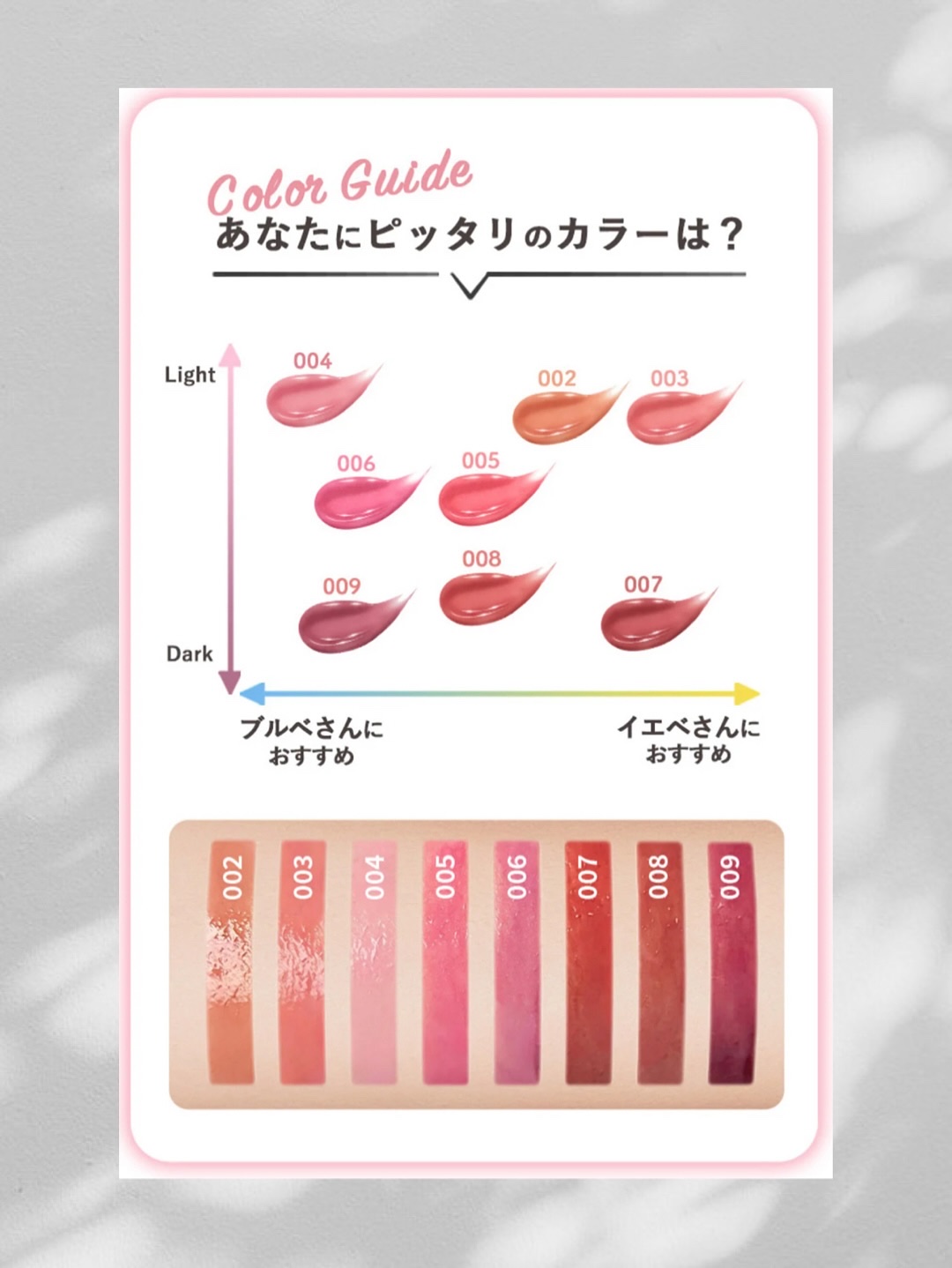 - うるんだツヤで、ぷっくり*唇 クリアな発色で、うるおい色づく口元に 1.輝きあふれるようなツヤ 輝きがあふれるような、濃密なツヤ感がつづく 2. 立体的な、ぷっくり感* うるおいツヤやかで立体的な、ぷっくり感*のある唇を演出。 3.シアーでクリアな発色 透け感があり、重ねることで、より鮮やかな発色に 4.うるおい感で、唇をなめらかに とろけるように密着して、ぷっくり*とした滑らかな唇に。 *乳酸メチル(整肌成分)の冷感、保湿成分(ツバキ種子油、ヒマワリ種子油、アーモンド油、マカデミア種子油、ヒマシ油)によるメイクアップ効果
