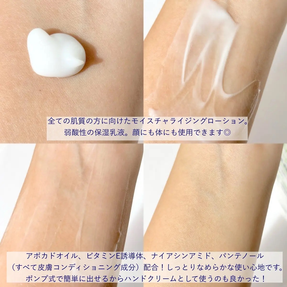- 乾燥肌・敏感肌向け保湿乳液 フェイス&ボディ 高保湿なうるおいで、しっとりなめらか肌へ ナイアシンアミド*1、パンテノール*1、グリセリン*2配合。 肌なじみのよい、さらっとした使い心地。 ・高保湿なうるおいで、しっとりなめらかな肌へ導きます。 無香料、低刺激性。 日本の敏感肌の方でパッチテスト*3、スティンギングテスト済。*4 *1: 皮膚コンディショニング成分 *2: 保湿成分 *3: すべての方に皮膚トラブルがおきないわけではありません。 *4: ピリピリ、ヒリヒリといった使用直後の刺激感を確かめるテストです。すべての方に刺激感がないというわけではありません。
