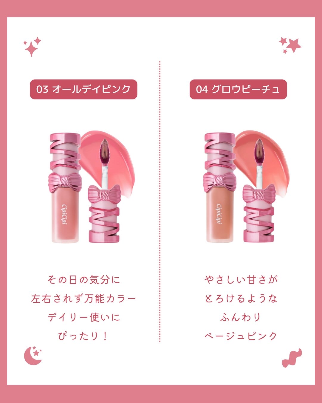 - <NEW POINT> ●リボンデザインがかわいい、CipiCipiオリジナルパッケージ ティントのツヤ感を表現した光沢感のあるリボンがデザインされたCipiCipiだけのオリジナルパッケージ。 細かいところも塗りやすいチップの形状はそのままに、塗っているときも、持っているときもかわいい見た目に! ●落ちにくさそのままに、クリア感UP 色持ちの良さはキープしたまま、少しだけクリアな発色にすることで、より使いやすいティントリップに。 ●塗り心地のなめらかさUP 水をベースにした水系処方はそのまま、重いオイルの配合量を減らして、軽くてべたつきにくいオイルの含有量をUPさせたことで、よりなめらかでべたつきにくいリップになりました。 <POINT> ●ツヤもち・色もち最上級(※) 軽い付け心地の高粘度オイル(※)が密着感を高め、鮮やかなカラーが徐々に溶け込むように馴染み、色もちも長時間キープ。 ※ブランド内において ●時間とともに、ツヤ浮かび上がる 時間とともにオイル膜が浮き上がり、唇をトップコートのようにコーティング。 ●乾燥しにくいみずみずしい唇へ 保湿成分配合で、みずみずしい唇をキープ。