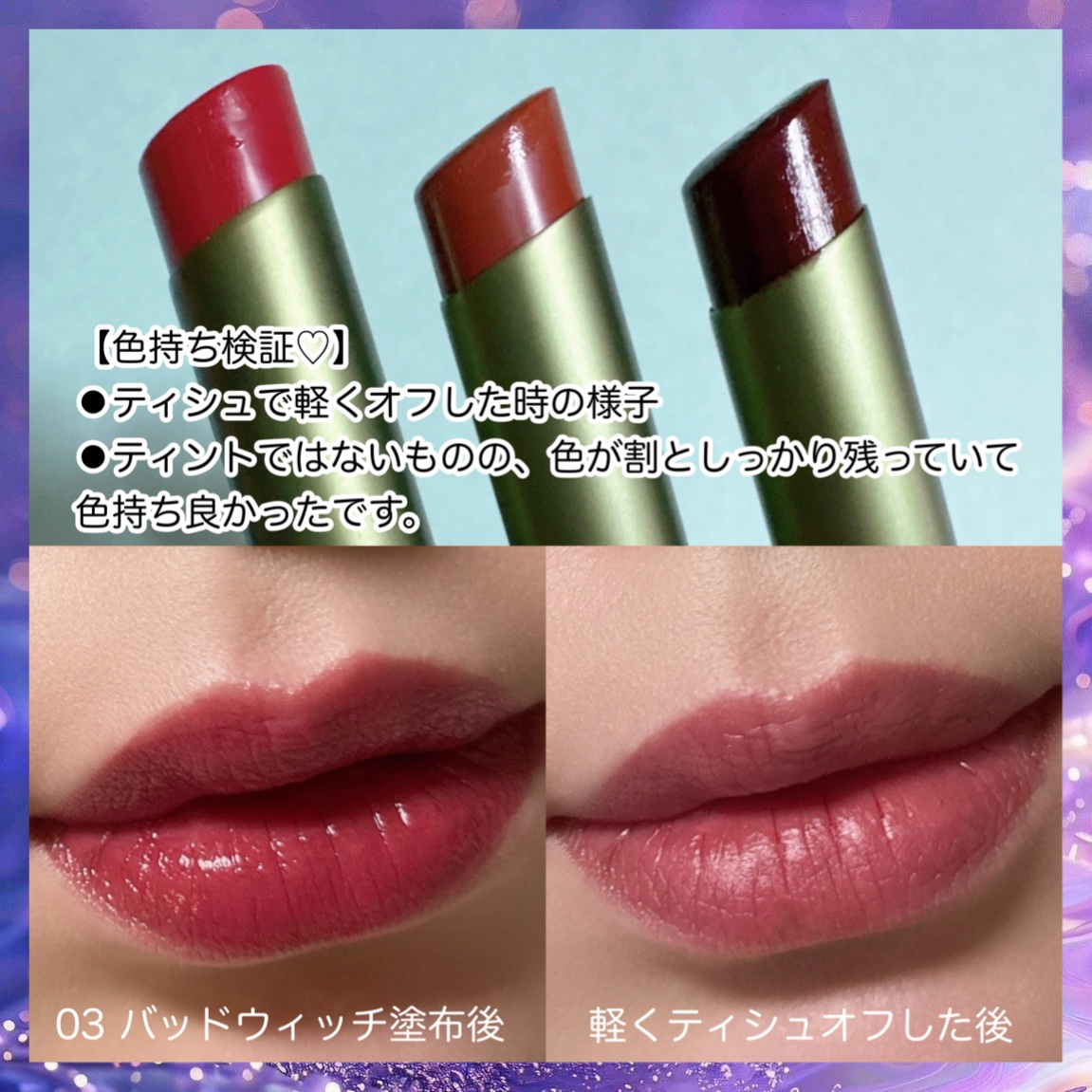 - <01 ピンクトリート> 水添ポリイソブテン、オクチルドデカノール、ダイマージリノール酸ダイマージリノレイルビス(ベヘニル/イソステアリル/フィトステリル)、ダイマージリノール酸水添ヒマシ油、テトラエチルヘキサン酸ペンタエリスリチル、合成ワックス、トリ(カプリル酸/カプリン酸)グリセリル、スクワラン、マイクロクリスタリンワックス、ダイマージリノール酸ダイマージリノレイル、カプリル酸プロピルヘプチル、テトライソステアリン酸ペンタエリスリチル、水添野菜油、ラウロイルグルタミン酸ジ(オクチルドデシル/フィトステリル/ベヘニル)、水添ポリデセン、リンゴ酸ジイソステアリル、ダイマージリノール酸ジオクチルドデシル、トリイソステアリン酸ポリグリセリル-2、トリ酢酸テトラステアリン酸スクロース、(セバシン酸/イソパルミチン酸)ジグリセリル、(エチレン/プロピレン)コポリマー、ジイソステアリン酸ポリグリセリル-2、プロパンジオール、トコフェロール、酸化鉄、酸化チタン、赤202、青1、赤223 <02 クラウドラテ> 水添ポリイソブテン、オクチルドデカノール、ダイマージリノール酸ダイマージリノレイルビス(ベヘニル/イソステアリル/フィトステリル)、ダイマージリノール酸水添ヒマシ油、テトラエチルヘキサン酸ペンタエリスリチル、合成ワックス、トリ(カプリル酸/カプリン酸)グリセリル、スクワラン、マイクロクリスタリンワックス、ダイマージリノール酸ダイマージリノレイル、カプリル酸プロピルヘプチル、テトライソステアリン酸ペンタエリスリチル、トリイソステアリン酸ポリグリセリル-2、水添野菜油、ラウロイルグルタミン酸ジ(オクチルドデシル/フィトステリル/ベヘニル)、水添ポリデセン、ダイマージリノール酸ジオクチルドデシル、トリ酢酸テトラステアリン酸スクロース、(セバシン酸/イソパルミチン酸)ジグリセリル、リンゴ酸ジイソステアリル、(エチレン/プロピレン)コポリマー、プロパンジオール、トリエトキシカプリリルシラン、トコフェロール、マイカ、酸化鉄、赤227、赤223 <03 バッドウィッチ> 水添ポリイソブテン、オクチルドデカノール、ダイマージリノール酸ダイマージリノレイルビス(ベヘニル/イソステアリル/フィトステリル)、ダイマージリノール酸水添ヒマシ油、テトラエチルヘキサン酸ペンタエリスリチル、合成ワックス、トリ(カプリル酸/カプリン酸)グリセリル、スクワラン、マイクロクリスタリンワックス、ダイマージリノール酸ダイマージリノレイル、カプリル酸プロピルヘプチル、テトライソステアリン酸ペンタエリスリチル、水添野菜油、ラウロイルグルタミン酸ジ(オクチルドデシル/フィトステリル/ベヘニル)、水添ポリデセン、リンゴ酸ジイソステアリル、ダイマージリノール酸ジオクチルドデシル、トリイソステアリン酸ポリグリセリル-2、トリ酢酸テトラステアリン酸スクロース、(セバシン酸/イソパルミチン酸)ジグリセリル、ジイソステアリン酸ポリグリセリル-2、(エチレン/プロピレン)コポリマー、プロパンジオール、トリエトキシカプリリルシラン、トコフェロール、マイカ、黄5、赤202、酸化鉄、黄4、青1、赤223
