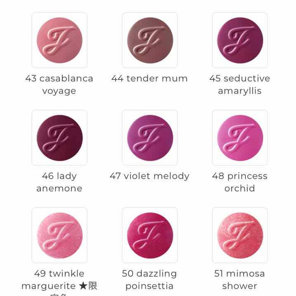 - <31 sweet gerbera> テトラエチルヘキサン酸ペンタエリスリチル、ダイマージリノール酸(フィトステリル/イソステアリル/セチル/ステアリル/ベヘニル)、トリメリト酸トリトリデシル、(VP/ヘキサデセン)コポリマー、ポリブテン、合成ワックス、トリイソステアリン酸ポリグリセリル-2、ポリエチレン、ジメチルシリル化シリカ、アボカド油、アンズ核油、トコフェロール、ラベンダー油、ローズマリーエキス、BHT、DPG、PEG-9ポリジメチルシロキシエチルジメチコン、(エチレン/プロピレン)コポリマー、ジイソステアリン酸ポリグリセリル-2、ジメチコン、デカイソステアリン酸ポリグリセリル-10、トリイソステアリン酸イソプロピルチタン、ハイドロゲンジメチコン、ミネラルオイル、メチコン、水酸化Al、炭酸Ca、香料、酸化チタン、酸化鉄、硫酸Ba、黄4、黄5、赤104(1)、赤202 <33 cherry blossom> テトラエチルヘキサン酸ペンタエリスリチル、ダイマージリノール酸(フィトステリル/イソステアリル/セチル/ステアリル/ベヘニル)、トリメリト酸トリトリデシル、(VP/ヘキサデセン)コポリマー、ポリブテン、合成ワックス、トリイソステアリン酸ポリグリセリル-2、ポリエチレン、ジメチルシリル化シリカ、アボカド油、アンズ核油、トコフェロール、ラベンダー油、ローズマリーエキス、BHT、DPG、PEG-9ポリジメチルシロキシエチルジメチコン、(エチレン/プロピレン)コポリマー、ジイソステアリン酸ポリグリセリル-2、ジメチコン、デカイソステアリン酸ポリグリセリル-10、トリイソステアリン酸イソプロピルチタン、ハイドロゲンジメチコン、ミネラルオイル、メチコン、水酸化Al、炭酸Ca、香料、酸化チタン、酸化鉄、硫酸Ba、黄4、赤202 <34 petit cherry> テトラエチルヘキサン酸ペンタエリスリチル、ダイマージリノール酸(フィトステリル/イソステアリル/セチル/ステアリル/ベヘニル)、トリメリト酸トリトリデシル、(VP/ヘキサデセン)コポリマー、ポリブテン、合成ワックス、トリイソステアリン酸ポリグリセリル-2、ポリエチレン、ジメチルシリル化シリカ、アボカド油、アンズ核油、トコフェロール、ラベンダー油、ローズマリーエキス、BHT、DPG、PEG-9ポリジメチルシロキシエチルジメチコン、(エチレン/プロピレン)コポリマー、ジイソステアリン酸ポリグリセリル-2、ジメチコン、デカイソステアリン酸ポリグリセリル-10、トリイソステアリン酸イソプロピルチタン、ハイドロゲンジメチコン、パーフルオロオクチルトリエトキシシラン、ホウケイ酸(Ca/Al)、ミネラルオイル、メチコン、酸化スズ、水酸化Al、炭酸Ca、香料、マイカ、酸化チタン、酸化鉄、硫酸Ba、黄4、赤202 <35 feminine lilac> テトラエチルヘキサン酸ペンタエリスリチル、ダイマージリノール酸(フィトステリル/イソステアリル/セチル/ステアリル/ベヘニル)、トリメリト酸トリトリデシル、(VP/ヘキサデセン)コポリマー、ポリブテン、トリイソステアリン酸ポリグリセリル-2、合成ワックス、ポリエチレン、ジメチルシリル化シリカ、アボカド油、アンズ核油、トコフェロール、ラベンダー油、ローズマリーエキス、BHT、DPG、PEG-9ポリジメチルシロキシエチルジメチコン、(エチレン/プロピレン)コポリマー、シリカ、ジイソステアリン酸ポリグリセリル-2、ジメチコン、デカイソステアリン酸ポリグリセリル-10、トリイソステアリン酸イソプロピルチタン、ハイドロゲンジメチコン、ミネラルオイル、メチコン、水酸化Al、炭酸Ca、香料、マイカ、酸化チタン、酸化鉄、硫酸Ba、黄4、赤202 <36 blooming daisy> テトラエチルヘキサン酸ペンタエリスリチル、ダイマージリノール酸(フィトステリル/イソステアリル/セチル/ステアリル/ベヘニル)、トリメリト酸トリトリデシル、(VP/ヘキサデセン)コポリマー、ポリブテン、合成ワックス、トリイソステアリン酸ポリグリセリル-2、ポリエチレン、ジメチルシリル化シリカ、アボカド油、アンズ核油、トコフェロール、ラベンダー油、ローズマリーエキス、BHT、DPG、PEG-9ポリジメチルシロキシエチルジメチコン、(エチレン/プロピレン)コポリマー、ジイソステアリン酸ポリグリセリル-2、ジメチコン、デカイソステアリン酸ポリグリセリル-10、トリイソステアリン酸イソプロピルチタン、ハイドロゲンジメチコン、ミネラルオイル、メチコン、水酸化Al、炭酸Ca、香料、酸化チタン、酸化鉄、硫酸Ba、黄4、赤202 <37 peony party> ダイマージリノール酸(フィトステリル/イソステアリル/セチル/ステアリル/ベヘニル)、トリメリト酸トリトリデシル、(VP/ヘキサデセン)コポリマー、ポリブテン、合成ワックス、トリイソステアリン酸ポリグリセリル-2、ポリエチレン、ジメチルシリル化シリカ、アボカド油、アンズ核油、トコフェロール、ラベンダー油、ローズマリーエキス、BHT、DPG、PEG-9ポリジメチルシロキシエチルジメチコン、(エチレン/プロピレン)コポリマー、ジイソステアリン酸ポリグリセリル-2、ジメチコン、デカイソステアリン酸ポリグリセリル-10、トリイソス