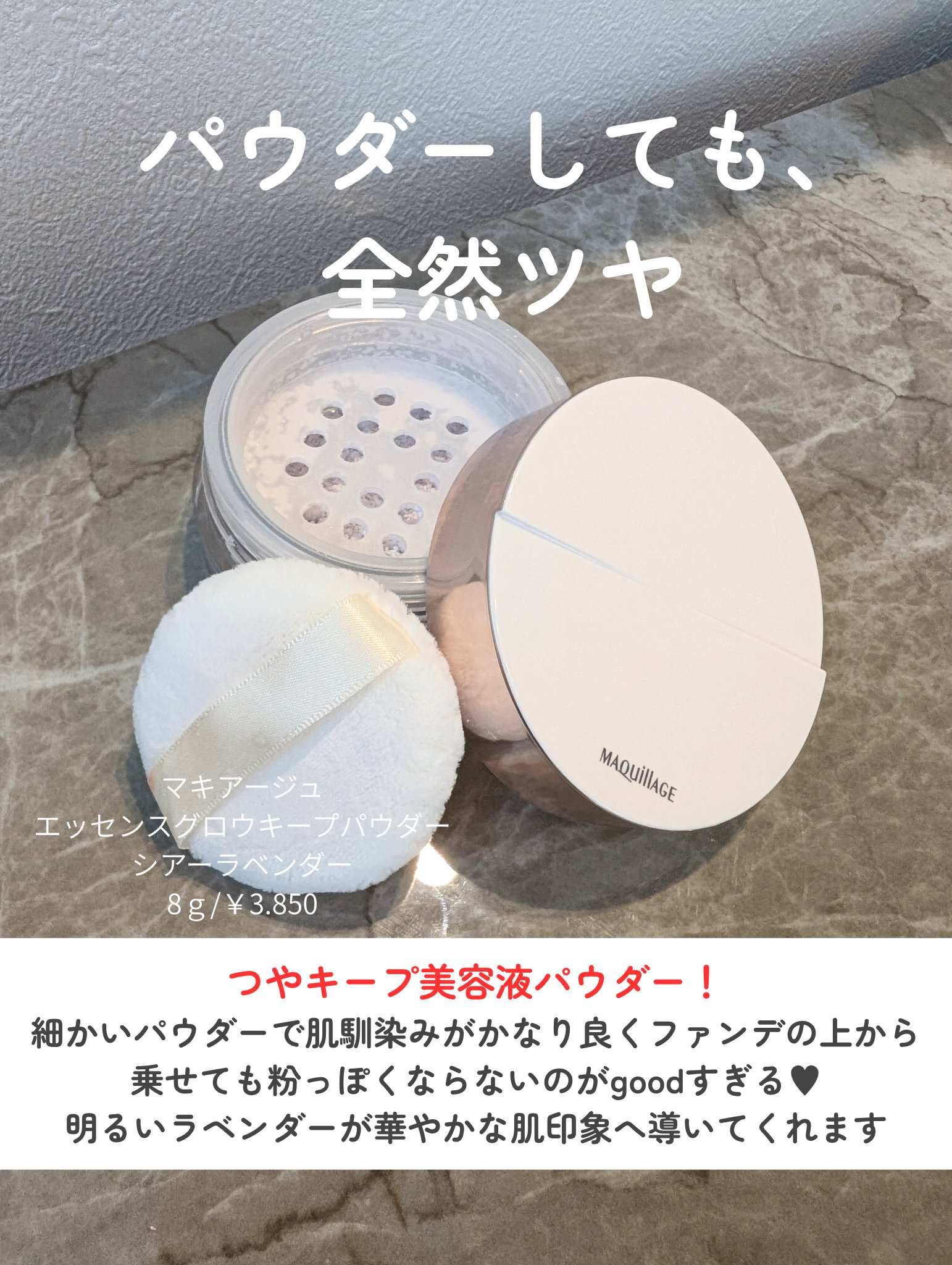 - エッセンスグロウキープパウダー<フェイスパウダー> パウダーしても、全然つや。つやキープ美容液パウダー。 2色展開 シアーアイボリー(自然なつや・透明感を演出) シアーラベンダー(自然なつや・透明感を演出しながら、トーンアップ) 本体:3,850円(税込)※ケース・パフ付き レフィル:3,080円(税込) パフ:660円(税込) ※価格は参考小売価格です。(店舗によって異なる場合があります) 【セラムコーティング製法】 美容液成分の「つやキープエッセンス」でパウダー1粒1粒包む独自のセラムコーティング製法を採用。 POINT1 「つやと透明感」が1日中*続く するすると溶け込み、メイクしたての「つやと透明感」が1日中*続く。 └「メイクしたての~」を冒頭に付けた上で、~自然なつや感であること等を補足することはOK └みずみずしいつやなどは本商品特徴とは異なるためNG *13時間化粧もち※データ取得済み ※つや・透明感・毛穴の目立ちのなさ・毛穴落ちのなさ・カバー力・よれのなさ・うすれのなさ・皮脂くずれのなさ・粉っぽさのなさ (当社調べ。効果には個人差があります) OR *13時間化粧もち(つや・透明感・毛穴の目立ちのなさ・毛穴落ちのなさ・カバー力・よれのなさ・うすれのなさ・皮脂くずれのなさ・粉っぽさのなさ )データ取得済み(当社調べ。効果には個人差があります) POINT2 粉感レスな質感 つやキープエッセンス配合or(高配合*) ×厳選パウダーバランスによって、 ファンデの上からでも粉感レスな使い心地。 *従来比(ドラマティックエッセンスヴェール ルースパウダー) POINT3 スキンケア効果 浸透型うるおい美容液α配合。角層のすみずみまでうるおいを届けます。