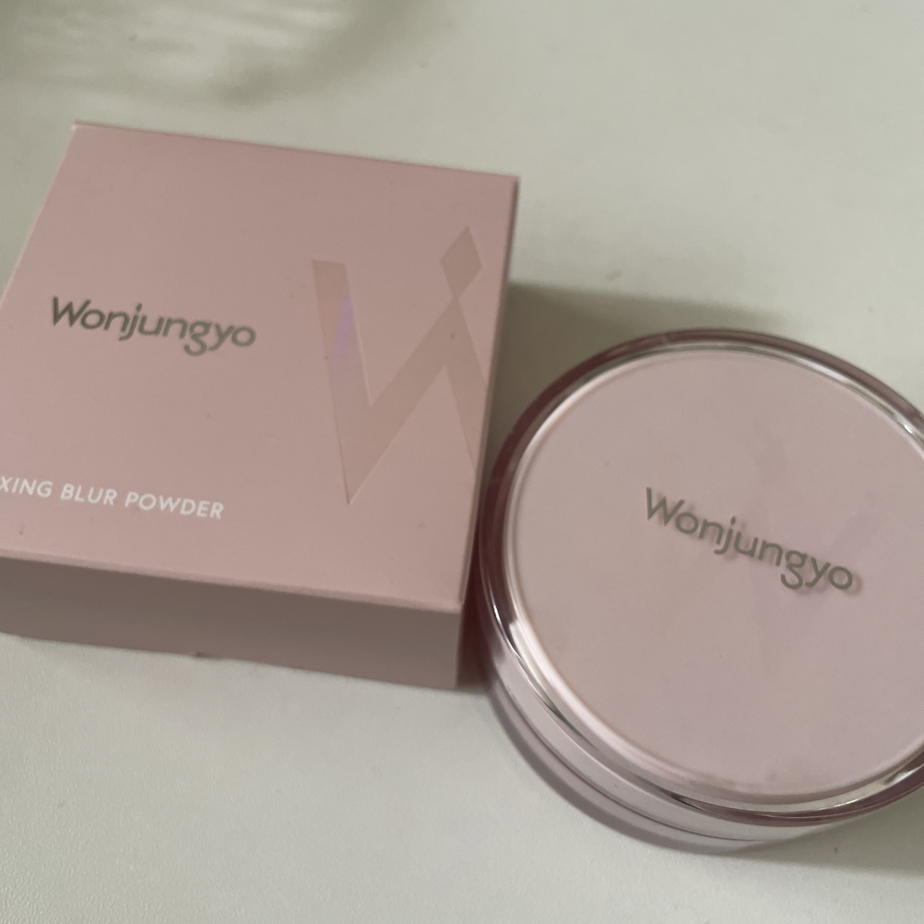 ウォンジョンヨ人気パウダー 毛穴凹凸カバー 色味はほんのりピンクで塗るとほんのりトーンアップして血色感が出ます。 毛穴の凹凸をカバーしてくれなめらかな肌に仕上げてくれます。