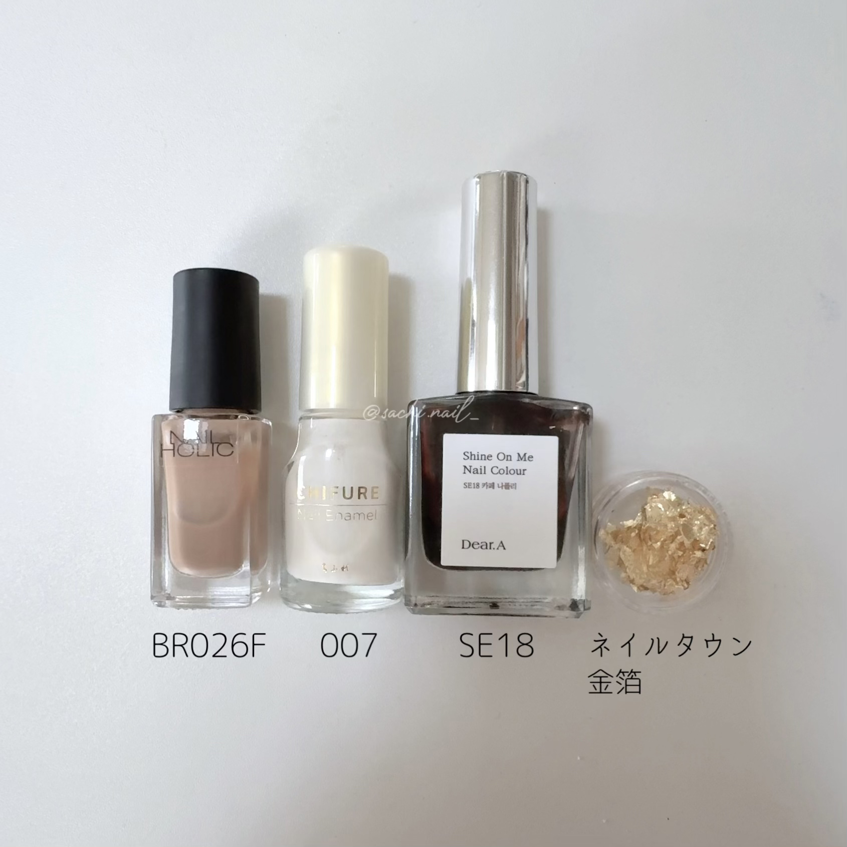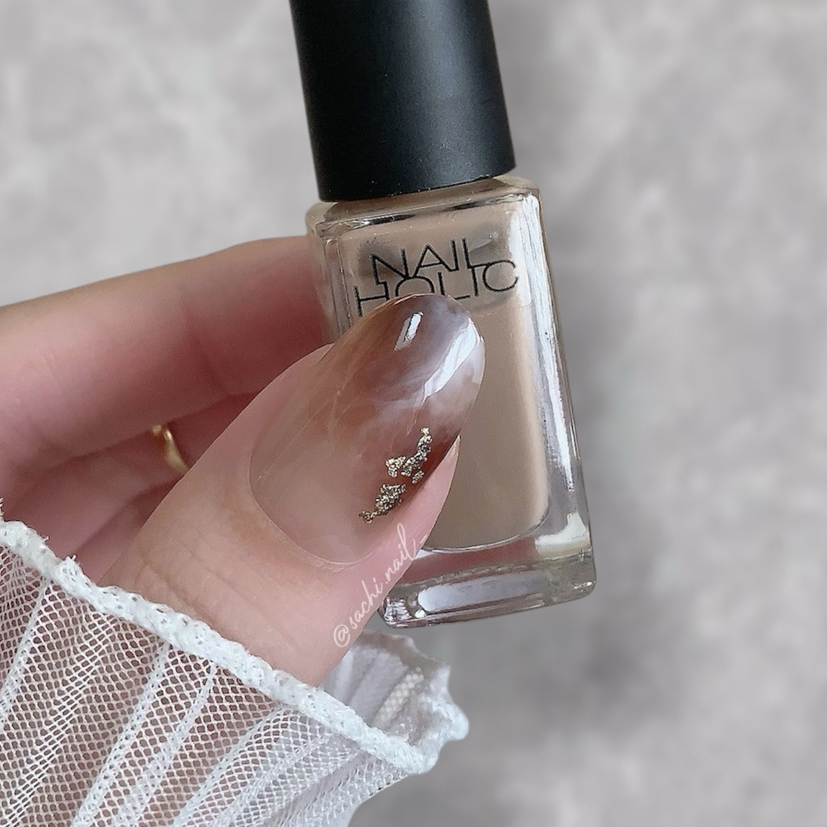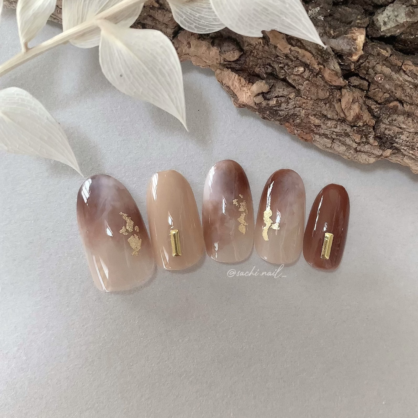 ワンカラーでも指ごとに色を変えるだけでオシャレに見えます💕 画像のようにゴールドラインとストーンを少し足すだけで華やかさがアップ🥰 何度かご紹介したことのあるスポンジで作るグラデーションです✨ スポンジを使うことで境目が綺麗に馴染んでくれます💕 アルミホイルの上でブラウンとトップコートを1:1くらいで混ぜたものを、トップコートのハケに取って3箇所に塗るだけ👌 事前に混ぜたものを塗ることで、爪の上でぼかすより簡単に出来ます💕 ベースカラーが乾く前に点置きしてぼかすことで綺麗にぼかせます✨ スピードが大事なので、使うポリッシュのキャップは全て開けておきましょう😊 天然石のラインはガタガタの方がより天然石っぽく見えるので、ラインを描くのが苦手な方でも大丈夫🙆♀️ 難しそうに見えて、やってみると意外と簡単に出来ます♡