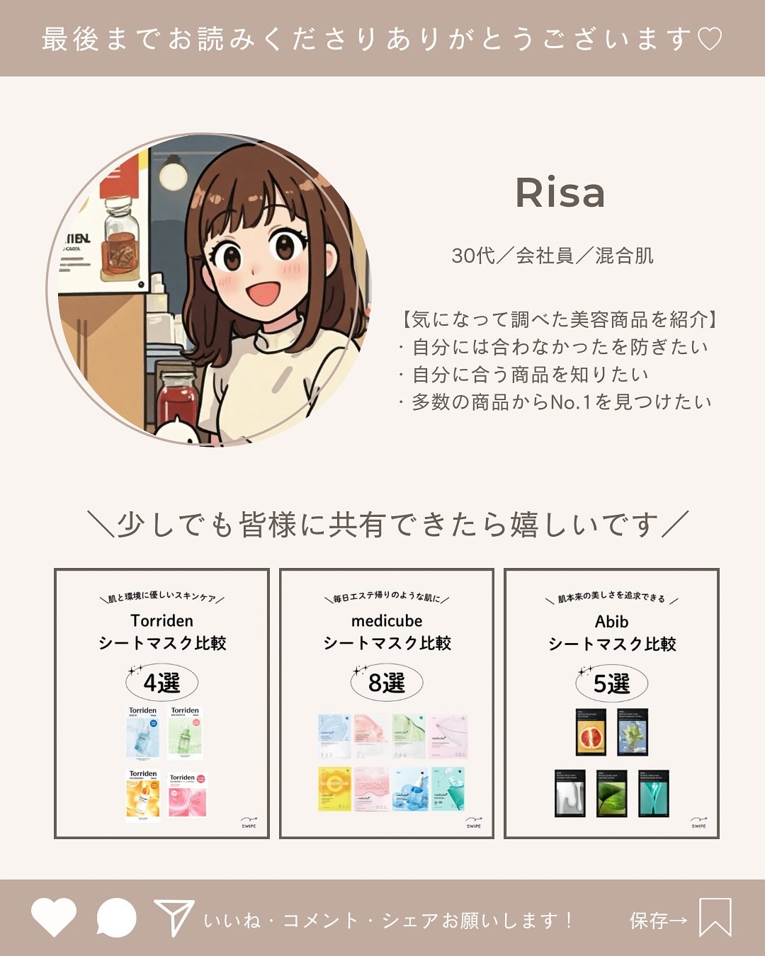 全部使い切ったけど、正直に言うと、うーん…って感じ この金額ならもっといいマスクあるよね…? 使用感大事な私は、このパックの素材がそもそも合わなくて、パックつけた時の気持ちい〜って感じが無いのが残念 唯一キニナルマスクは着け心地割とすきだったんだけど、これをつけてる時だけ何故かTゾーンがめちゃくちゃ乾燥して 鎮静に特化してる分、保湿はイマイチだったのかな、と感じました 絵とか可愛くて買った時はテンション上がるけどリピはないかなあ…