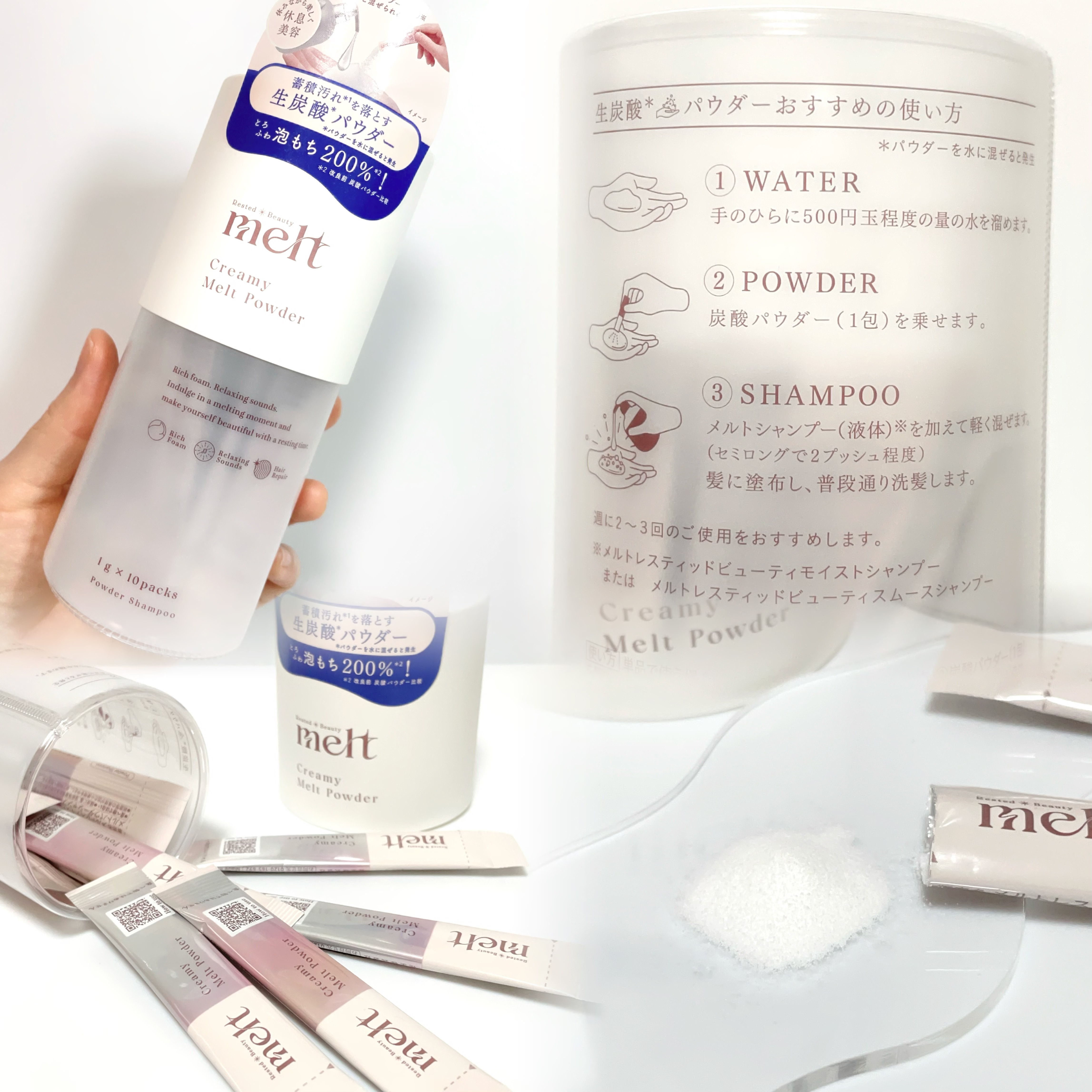 メルトモイストシャンプー/トリートメントメルトクリーミーメルトフォームクリーミーメルトフォームはシャンプーと混ぜて使います。クリーミーな炭酸泡になって髪となじませた時の泡立ちが良くて、すごく気持ちいい!洗い上がりもすっきりします♡頭皮の皮脂汚...
