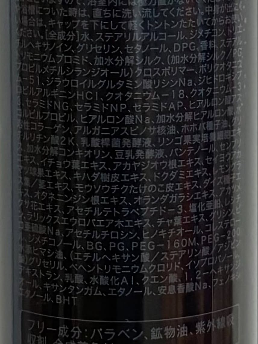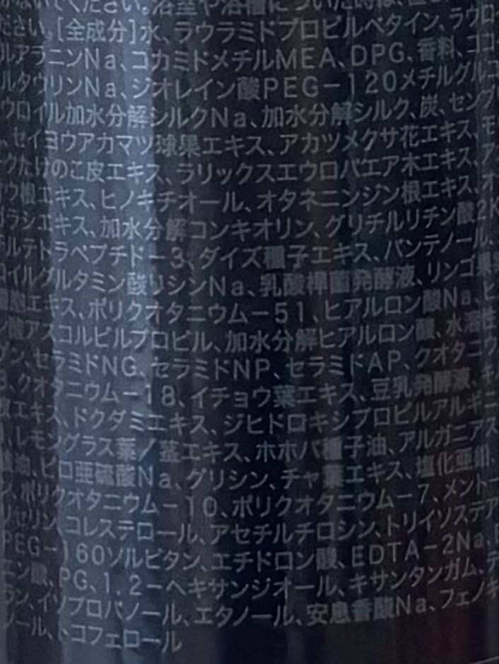- <シャンプー(250ml)> 水、ラウラミドプロピルベタイン、ラウロイルメチルアラニンNa、コカミドメチルMEA、DPG、香料、ココイルメチルタウリンNa、ジオレイン酸PEG-120メチルグルコース、ラウロイル加水分解シルクNa、加水分解シルク、炭、センブリエキス、セイヨウアカマツ球果エキス、アカツメクサ花エキス、モウソウチクたけのこ皮エキス、ラリックスエウロパエア木エキス、アカヤジオウ根エキス、ヒノキチオール、オタネニンジン根エキス、オランダガラシエキス、加水分解コンキオリン、グリチルリチン酸2K、アセチルテトラペプチド-3、ダイズ種子エキス、パンテノール、ジラウロイルグルタミン酸リシンNa、乳酸桿菌発酵液、リンゴ果実培養細胞エキス、ポリクオタニウム-51、ヒアルロン酸Na、ヒアルロン酸アスコルビルプロピル、加水分解ヒアルロン酸、水溶性コラーゲン、セラミドNG、セラミドNP、セラミドAP、クオタニウム-33、クオタニウム-18、イチョウ葉エキス、豆乳発酵液、キハダ樹皮エキス、ドクダミエキス、ジヒドロキシプロピルアルギニンHCl、レモングラス葉/茎エキス、ホホバ種子油、アルガニアスピノサ核油、ピロ亜硫酸Na、グリシン、チャ葉エキス、塩化亜鉛、レシチン、ポリクオタニウム-10、ポリクオタニウム-7、メントール、グリセリン、コレステロール、アセチルチロシン、トリイソステアリン酸PEG-160ソルビタン、エチドロン酸、EDTA-2Na、BG、クエン酸、PG、1,2-ヘキサンジオール、キサンタンガム、デキストラン、イソプロパノール、エタノール、安息香酸Na、フェノキシエタノール、トコフェロール <トリートメント(250ml)> 水、ステアリルアルコール、ジメチコン、トリエチルヘキサノイン、グリセリン、セタノール、DPG、香料、ステアルトリモニウムブロミド、加水分解シルク、(加水分解シルク/PGプロピルメチルシランジオール)クロスポリマー、ポリクオタニウム-51、ジラウロイルグルタミン酸リシンNa、ジヒドロキシプロピルアルギニンHCl、クオタニウム-18、クオタニウム-33、セラミドNG、セラミドNP、セラミドAP、ヒアルロン酸アスコルビルプロピル、ヒアルロン酸Na、加水分解ヒアルロン酸、水溶性コラーゲン、アルガニアスピノサ核油、ホホバ種子油、グリチルリチン酸2K、乳酸桿菌発酵液、リンゴ果実培養細胞エキス、加水分解コンキオリン、豆乳発酵液、パンテノール、センブリエキス、イチョウ葉エキス、アカヤジオウ根エキス、セイヨウアカマツ球果エキス、キハダ樹皮エキス、ドクダミエキス、レモングラス葉/茎エキス、モウソウチクたけのこ皮エキス、ダイズ種子エキス、オタネニンジン根エキス、オランダガラシエキス、アカツメクサ花エキス、アセチルテトラペプチド-3、塩化亜鉛、レシチン、ラリックスエウロパエア木エキス、チャ葉エキス、グリシン、ピロ亜硫酸Na、アセチルチロシン、ヒノキチオール、コレステロール、ジメチコノール、BG、PG、PEG-160M、PEG-200水添ヒマシ油、(エチルヘキサン酸/ステアリン酸/アジピン酸)グリセリル、ベヘントリモニウムクロリド、イソプロパノール、デキストラン、乳酸、水酸化Al、クエン酸、1,2-ヘキサンジオール、キサンタンガム、エタノール、安息香酸Na、フェノキシエタノール、BHT