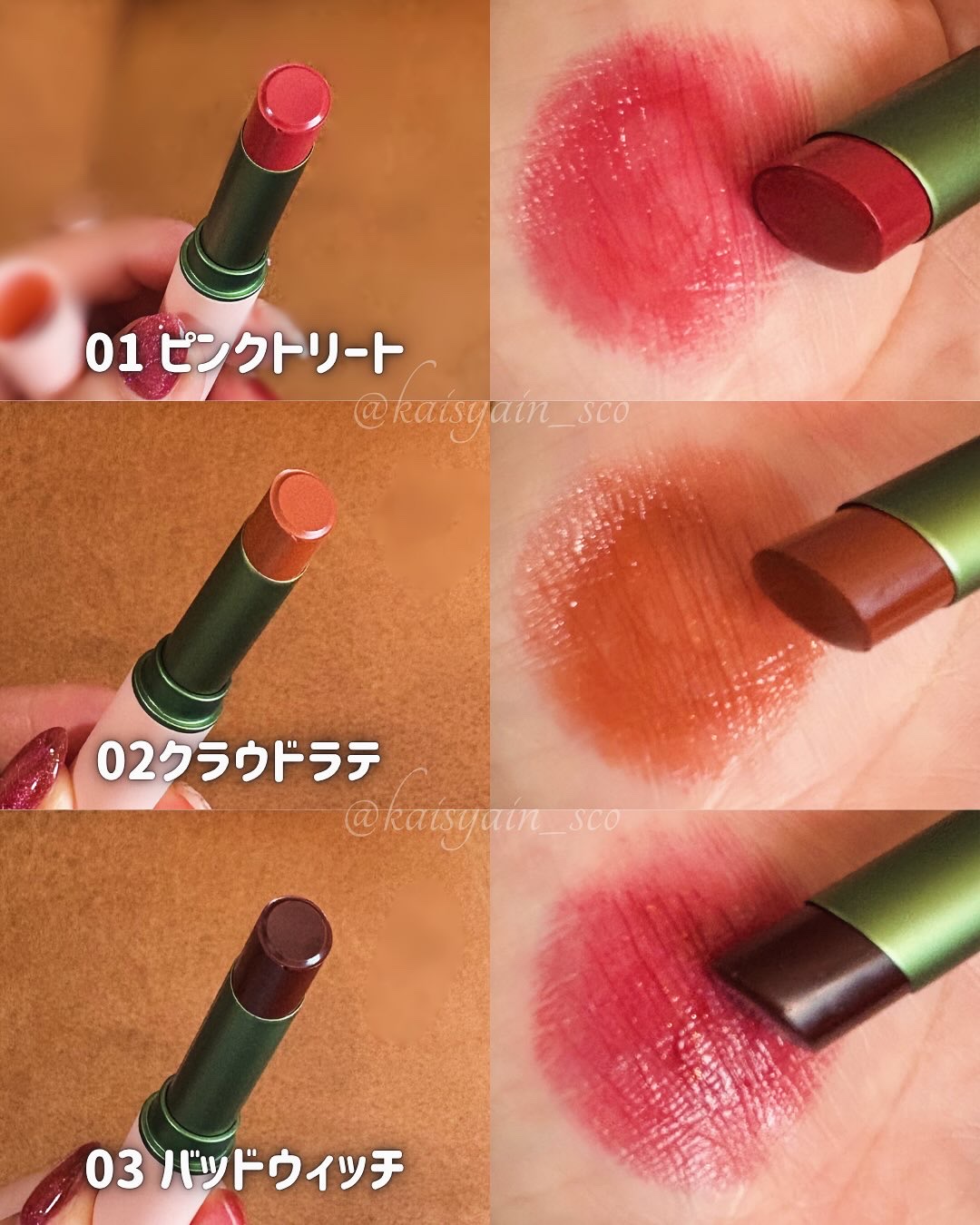 - <01 ピンクトリート> 水添ポリイソブテン、オクチルドデカノール、ダイマージリノール酸ダイマージリノレイルビス(ベヘニル/イソステアリル/フィトステリル)、ダイマージリノール酸水添ヒマシ油、テトラエチルヘキサン酸ペンタエリスリチル、合成ワックス、トリ(カプリル酸/カプリン酸)グリセリル、スクワラン、マイクロクリスタリンワックス、ダイマージリノール酸ダイマージリノレイル、カプリル酸プロピルヘプチル、テトライソステアリン酸ペンタエリスリチル、水添野菜油、ラウロイルグルタミン酸ジ(オクチルドデシル/フィトステリル/ベヘニル)、水添ポリデセン、リンゴ酸ジイソステアリル、ダイマージリノール酸ジオクチルドデシル、トリイソステアリン酸ポリグリセリル-2、トリ酢酸テトラステアリン酸スクロース、(セバシン酸/イソパルミチン酸)ジグリセリル、(エチレン/プロピレン)コポリマー、ジイソステアリン酸ポリグリセリル-2、プロパンジオール、トコフェロール、酸化鉄、酸化チタン、赤202、青1、赤223 <02 クラウドラテ> 水添ポリイソブテン、オクチルドデカノール、ダイマージリノール酸ダイマージリノレイルビス(ベヘニル/イソステアリル/フィトステリル)、ダイマージリノール酸水添ヒマシ油、テトラエチルヘキサン酸ペンタエリスリチル、合成ワックス、トリ(カプリル酸/カプリン酸)グリセリル、スクワラン、マイクロクリスタリンワックス、ダイマージリノール酸ダイマージリノレイル、カプリル酸プロピルヘプチル、テトライソステアリン酸ペンタエリスリチル、トリイソステアリン酸ポリグリセリル-2、水添野菜油、ラウロイルグルタミン酸ジ(オクチルドデシル/フィトステリル/ベヘニル)、水添ポリデセン、ダイマージリノール酸ジオクチルドデシル、トリ酢酸テトラステアリン酸スクロース、(セバシン酸/イソパルミチン酸)ジグリセリル、リンゴ酸ジイソステアリル、(エチレン/プロピレン)コポリマー、プロパンジオール、トリエトキシカプリリルシラン、トコフェロール、マイカ、酸化鉄、赤227、赤223 <03 バッドウィッチ> 水添ポリイソブテン、オクチルドデカノール、ダイマージリノール酸ダイマージリノレイルビス(ベヘニル/イソステアリル/フィトステリル)、ダイマージリノール酸水添ヒマシ油、テトラエチルヘキサン酸ペンタエリスリチル、合成ワックス、トリ(カプリル酸/カプリン酸)グリセリル、スクワラン、マイクロクリスタリンワックス、ダイマージリノール酸ダイマージリノレイル、カプリル酸プロピルヘプチル、テトライソステアリン酸ペンタエリスリチル、水添野菜油、ラウロイルグルタミン酸ジ(オクチルドデシル/フィトステリル/ベヘニル)、水添ポリデセン、リンゴ酸ジイソステアリル、ダイマージリノール酸ジオクチルドデシル、トリイソステアリン酸ポリグリセリル-2、トリ酢酸テトラステアリン酸スクロース、(セバシン酸/イソパルミチン酸)ジグリセリル、ジイソステアリン酸ポリグリセリル-2、(エチレン/プロピレン)コポリマー、プロパンジオール、トリエトキシカプリリルシラン、トコフェロール、マイカ、黄5、赤202、酸化鉄、黄4、青1、赤223