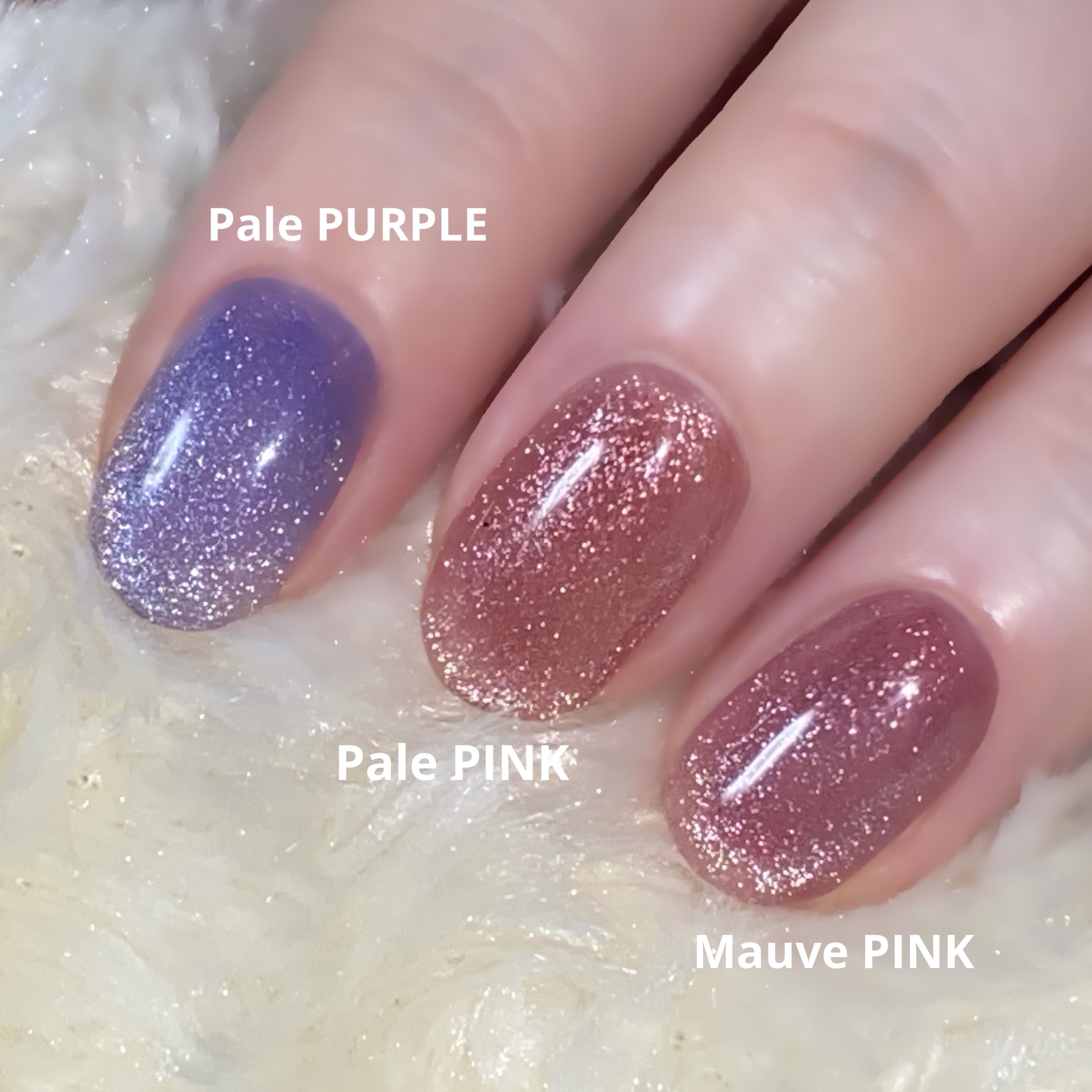 ベースカラーは黒っぽいシアーカラーにマグネットでは動かないパープルやブルーのラメが入っています。 シルバーのラメはマグネットでスイスイ動きました。宇宙っぽい配色で可愛いです。 塗布量に差があったのかベースカラーの濃さが異なりますが、どちらも2度塗りです。