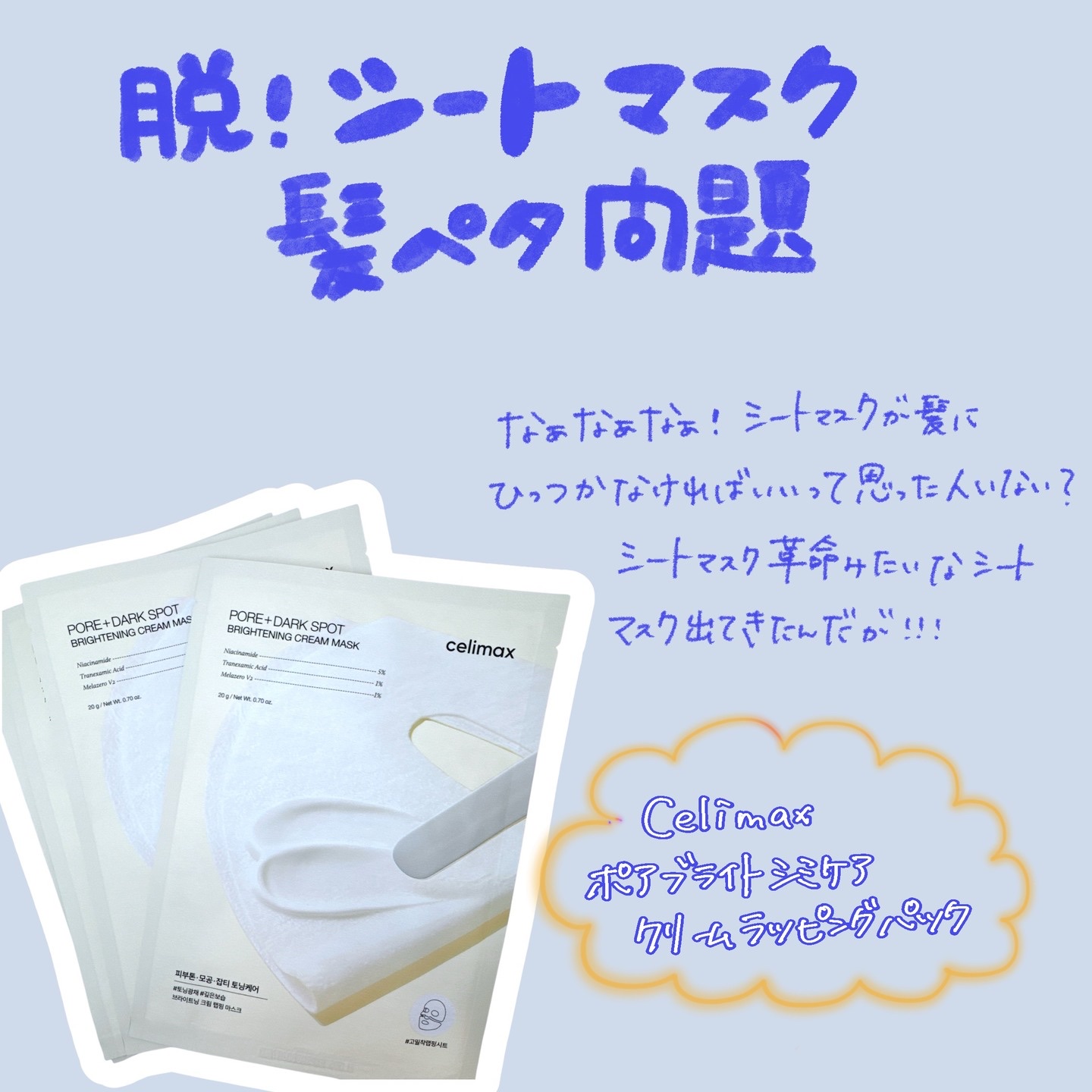 celimaxさまからいただきました♡ポアブライトニングシミケアクリームラッピングパック内側はクリームたっぷりでフィット感のいいセパレートのパック!特殊コーティングラッピングシートで、内側のみにクリームを塗布!髪の毛などがつかずに快適でした✨...