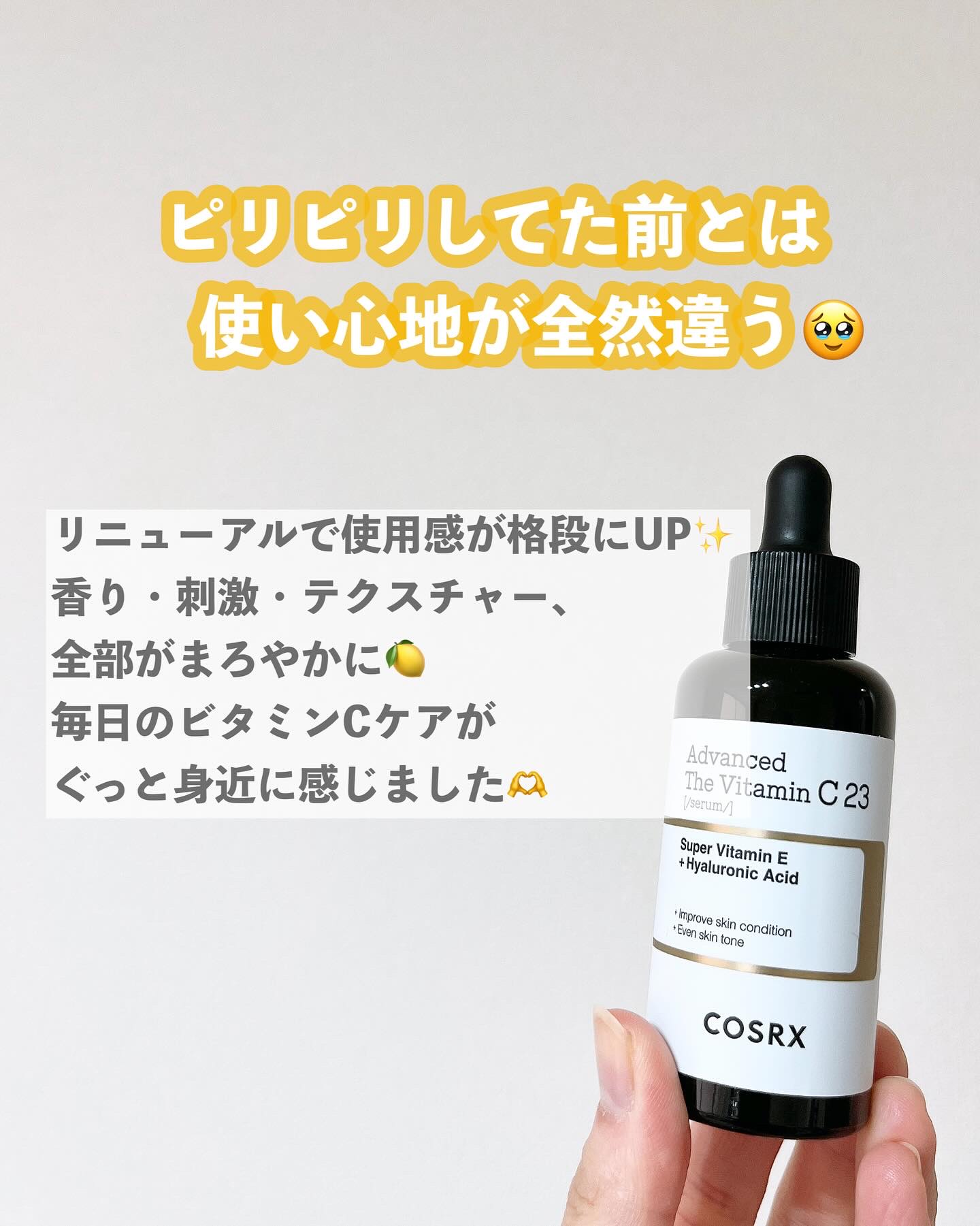 【COSRXRXアドバンスドザ・ビタミンC23セラム】ツナ缶の匂いが無くなってかなり使いやすくリニューアル!!リニューアル前のも使ったことありますがどうしてもビタミンCのオイル感が苦手でビタミンCを取り入れたいと思いつつなかなか手が伸びない状...