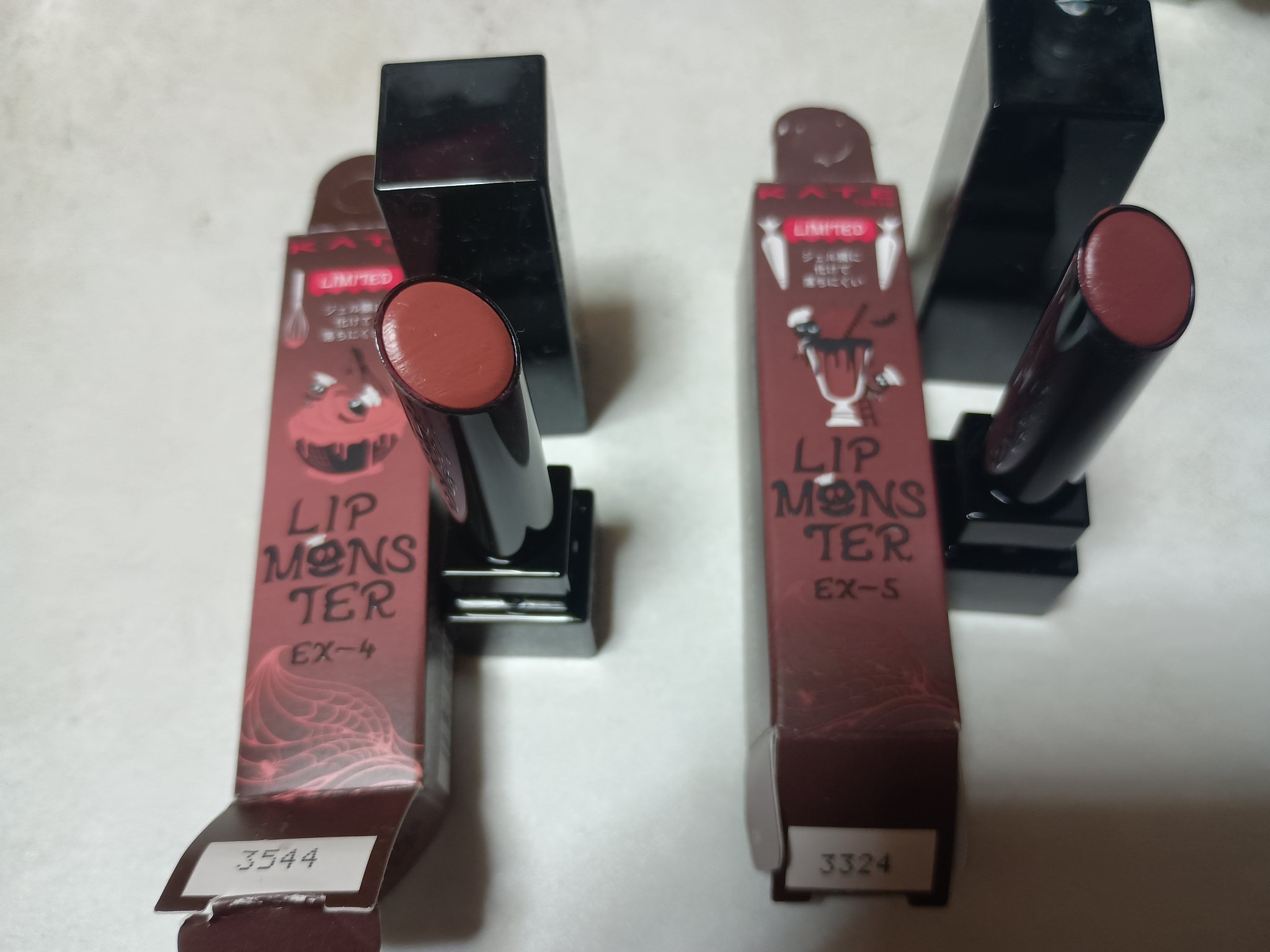 KATE リップモンスター EX-3 生焼けパンケーキ EX-4 ピンクバナナホイップ EX-5 ヴァンパイアフラッペ 各¥1,540 全然大丈夫だった!! つけてみると優しい色合いって印象かな🤔 血色感があるベージュで本当好き🍨