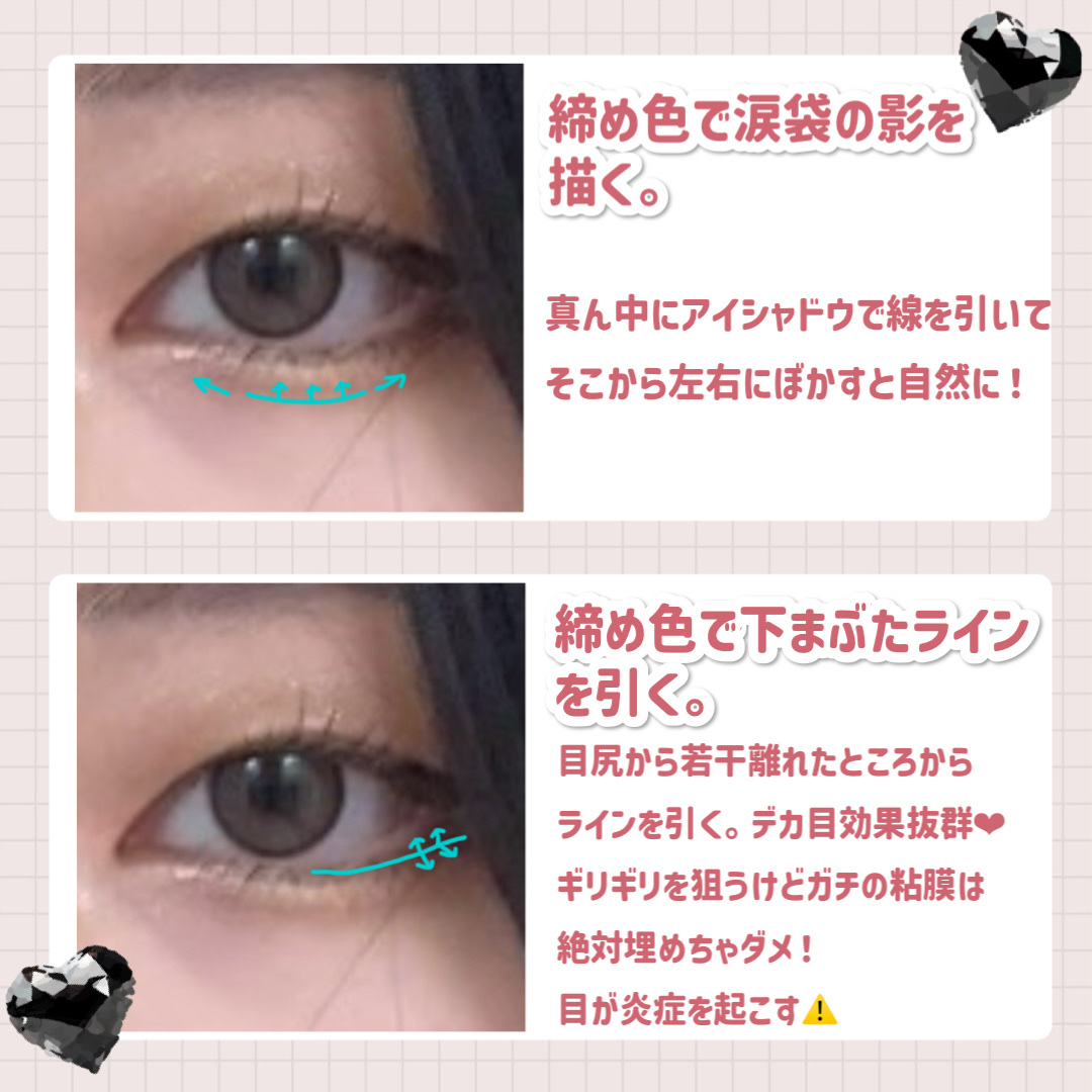 自分の好きなメイクをするのが一番ですが、得意な涙袋メイクを知ることで自分の魅力をもっと引き出すことができます! ぷっくり涙袋メイクが似合う人の大きな特徴は、出目の人(元々涙袋がある人)・黒目の割合が多い人(大きめのカラコンを使う人も該当) アンダーアイメイクが似合う人の特徴は、三白眼の人(aespaのカリナさんなど)・奥目の人(目の下が平面的で元々涙袋が目立たないタイプの人)