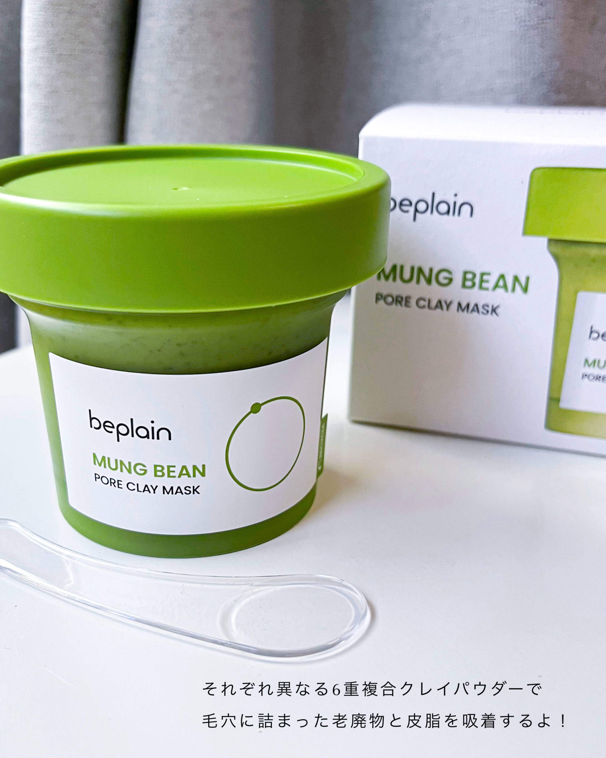 🌙beplain緑豆毛穴クレイパック3分で毛穴ケア完了!?緑豆のクレイパック✨緑豆に含まれるサポニンっていう成分やアミノ酸系の成分が古い皮脂や角質の除去に役立つんだって!!さらに6重複合クレイパウダーで古い皮脂や角質を吸着✔️顔に塗り広げて3...