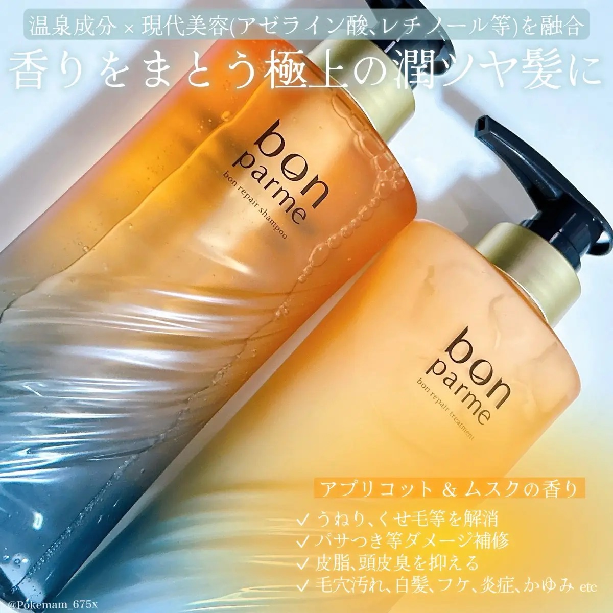 \bonparme/空気中の潤いも髪に取り込む新感覚ヘアケア🧡ポンリペアシャンプーボンリペアトリートメントシルクのスカーフを滑らせたような素敵すぎるボトルデザイン✨ボンパルムは古くから続く湯治に着目し、髪のケラチン生成を促すシリカなど頭皮と髪...