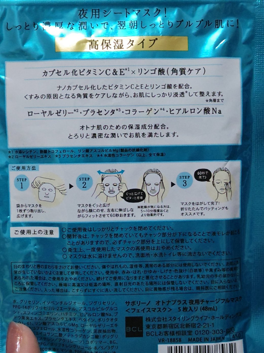サボリーノオトナプラス夜用チャージフルマスクLO21〈説明〉 ・サボリーノ・パック・32枚入り・¥1,760・アルコール、メントールフリー/無鉱物油/無香料〈感想〉最短60秒でスキンケア完了(化粧水、乳液、美容液、クリーム、パック)しますが、...