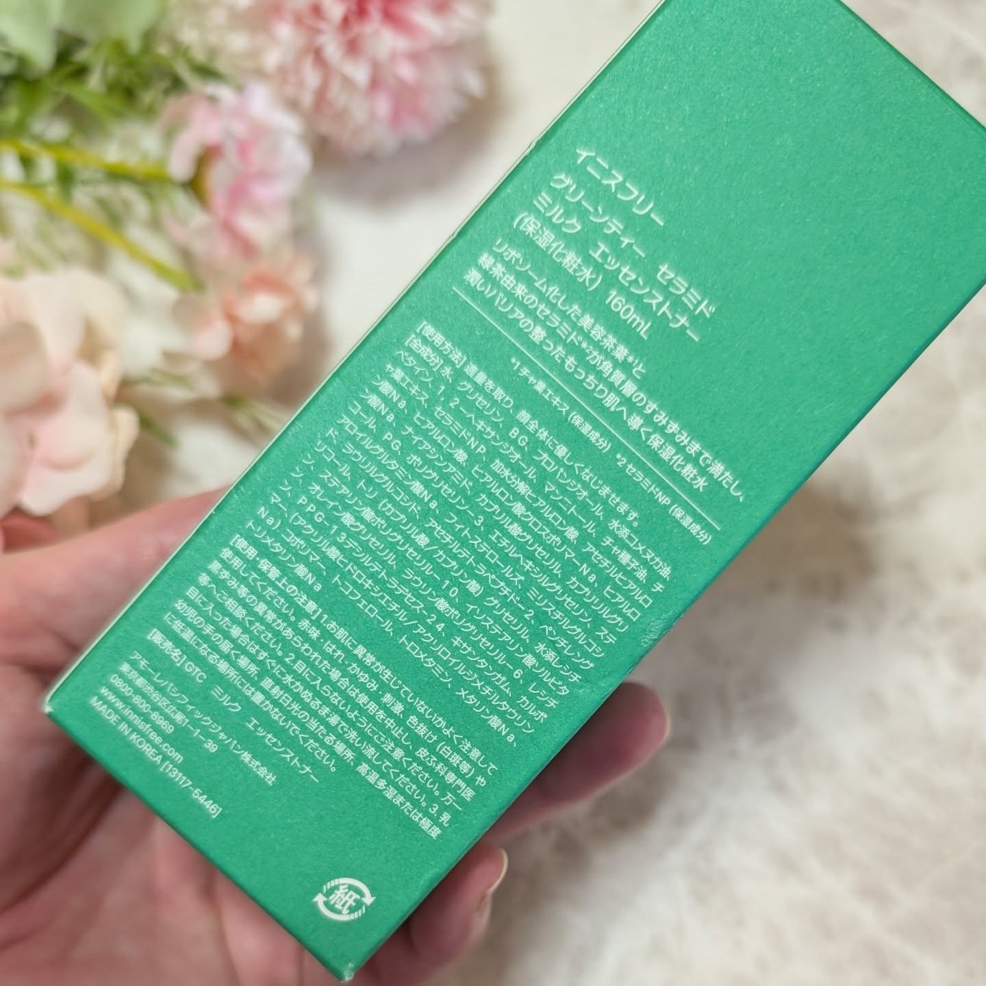 - 美容茶葉*1×セラミド*2の新感覚*3浸透*4ミルク化粧水 潤いバリアの満ちたうるもち肌へ 1. スーパーグリーンティー™*5で潤いを引き込んで保湿 イニスフリー独自原料の美容茶葉をマイクロサイズにリポソーム化したスーパーグリーンティー™*5を新開発!毛穴の1/2,274と超微粒子サイズで、ヒアルロン酸の5倍*6の高い保湿力を持つスーパーグリーンティー™*5は、肌へ「素早く・深く*4・長く」潤いを届けます。みずみずしくて透明感*7のある、角質層の内側から潤いあふれる肌へ導きます。 2. 高純度グリーンティーセラミド*2による潤いバリアケア チェジュ島の茶畑から収穫された緑茶由来の高純度セラミド*2を配合。一般的なセラミドの2.3倍*8の保湿力を持ち、乱れた潤いバリアを集中的に整えます。潤いが満ちたふっくら弾むようななめらか肌を長時間キープします。 3. 軽やかで深い浸透力*4のミルキーテクスチャー 有用成分を肌に深く*4届けるための処方技術を採用。とろみのあるやわらかなミルキーテクスチャーながら軽やかで浸透*4が良く、角質層のすみずみまで潤いを届けます。 4. 美容成分を豊富に配合 異なる特性を持つ数種類のヒアルロン酸*9やナイアシンアミド*10、ペプチド*11も配合。潤いで満たしつつ、健やかな肌へ導きます。 ・ヴィーガン処方*12 ・敏感肌でも使いやすい低刺激処方*13 ・無香料 ・ノンコメドジェニックテスト済*14 *1 チャ葉エキス(保湿成分) *2 セラミドNP(保湿成分) *3 使用感のこと(自社製品内において) *4 角質層まで *5 チャ葉エキス、チャ種子油(全て保湿成分)*6 in vitro試験結果:スーパーグリーンティーTMと一般的なヒアルロン酸の有用性の比較による(社内比較)、原料特性に限る *7 潤いを与えることによる *8 in vitro試験結果:グリーンティーセラミドと合成セラミドの有用性の比較(社内比較)、原料特性に限る *9 加水分解ヒアルロン酸、アセチルヒアルロン酸Na、ヒアルロン酸、ヒアルロン酸クロスポリマーNa、ヒアルロン酸Na(全て保湿成分) *10 保湿成分 *11 アセチルテトラペプチド-2(保湿成分) *12 韓国ヴィーガン認証院にて *13 低刺激テスト済/自社調べ(すべての人に刺激が起こらないというわけではありません) *14 すべての方にコメド(ニキビのもと)ができないというわけではありません