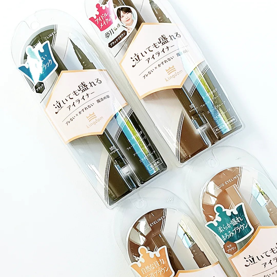 - キングダム リキッドアイライナーTPは、初心者でも、簡単に理想のアイラインが引きやすい「魔法の筆」を採用。ブレにくく描ける安定感とかすれにくく描けることが特長で、日常使いからステージメイクまで幅広く対応します。 さらに、落ちにくさも強化*。「こすれプルーフ」を含む3つのプルーフ処方へと進化*しました。 Point 1:誰でもプロ級!ブレにくい × かすれにくい「魔法の筆」 「ブレにくく描ける」丸形センイと、「かすれにくく描ける」星形センイをブレンドし、0.1mmの極細ラインもなめらかに描けます。 ●【丸形センイ:ブレにくい】太さの異なるセンイを絶妙なバランスで配合。手ブレしにくい、コシのある筆を実現! ●【星形センイ:かすれにくい】凹み部分に液をたっぷり含むことができるため、かすれにくい! Point 2:涙・皮脂・こすれに強い!3つのプルーフ処方 ①涙・水・汗に強い:ウォータープルーフ ②皮脂に強い:スマッジプルーフ ③こすれに強い:こすれプルーフ <ブラウン> 自然な目力 王道ブラウン。 <ブラック> 強すぎない絶妙ブラック。 <ブラックブラウン> 黒の目力×茶の柔らかさを兼ねそろえた黒みブラウン。 <ラテブラウン> 柔らか盛れ まろみラテブラウン。 *自社従来品との比較