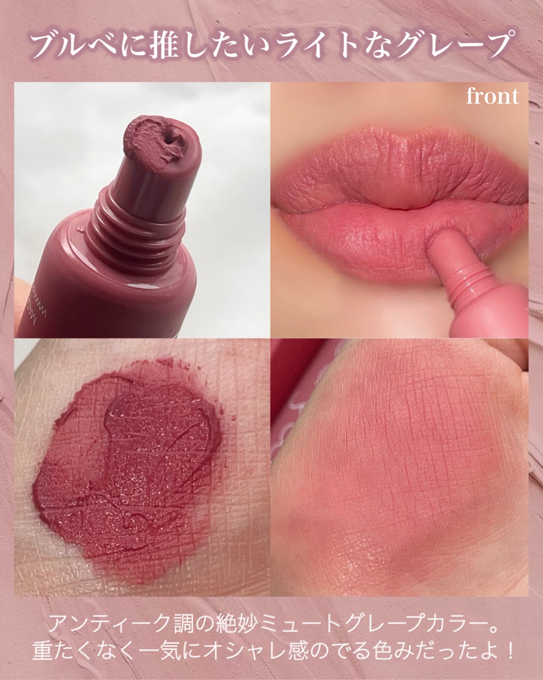 \パキッと色づく❣️絶妙ミュートグレープ🍇/♡rom&ndCOLORLIPMATTE02.HUSHGRAPE彩度低めの、くすみのあるモーヴピンク色。紫みの感じられる絶妙カラーで可愛い🥰プライマーのように、縦じわを埋めてくれるパウダリーなテクス...